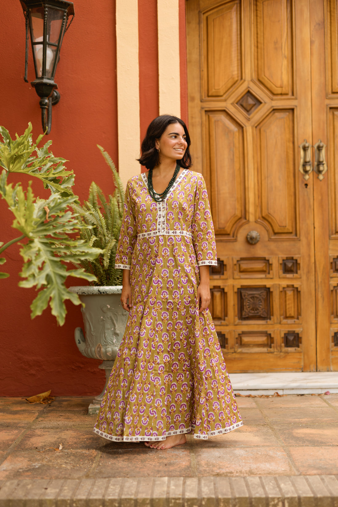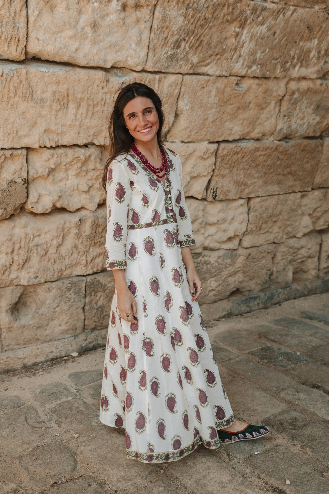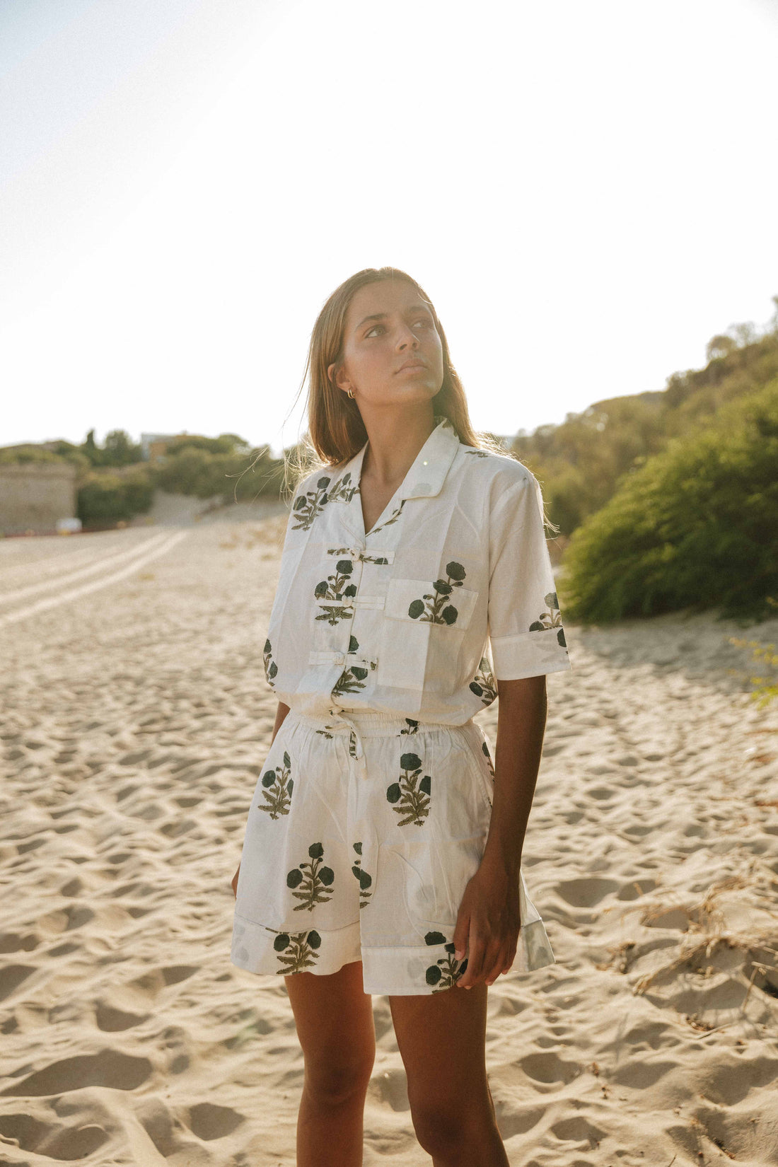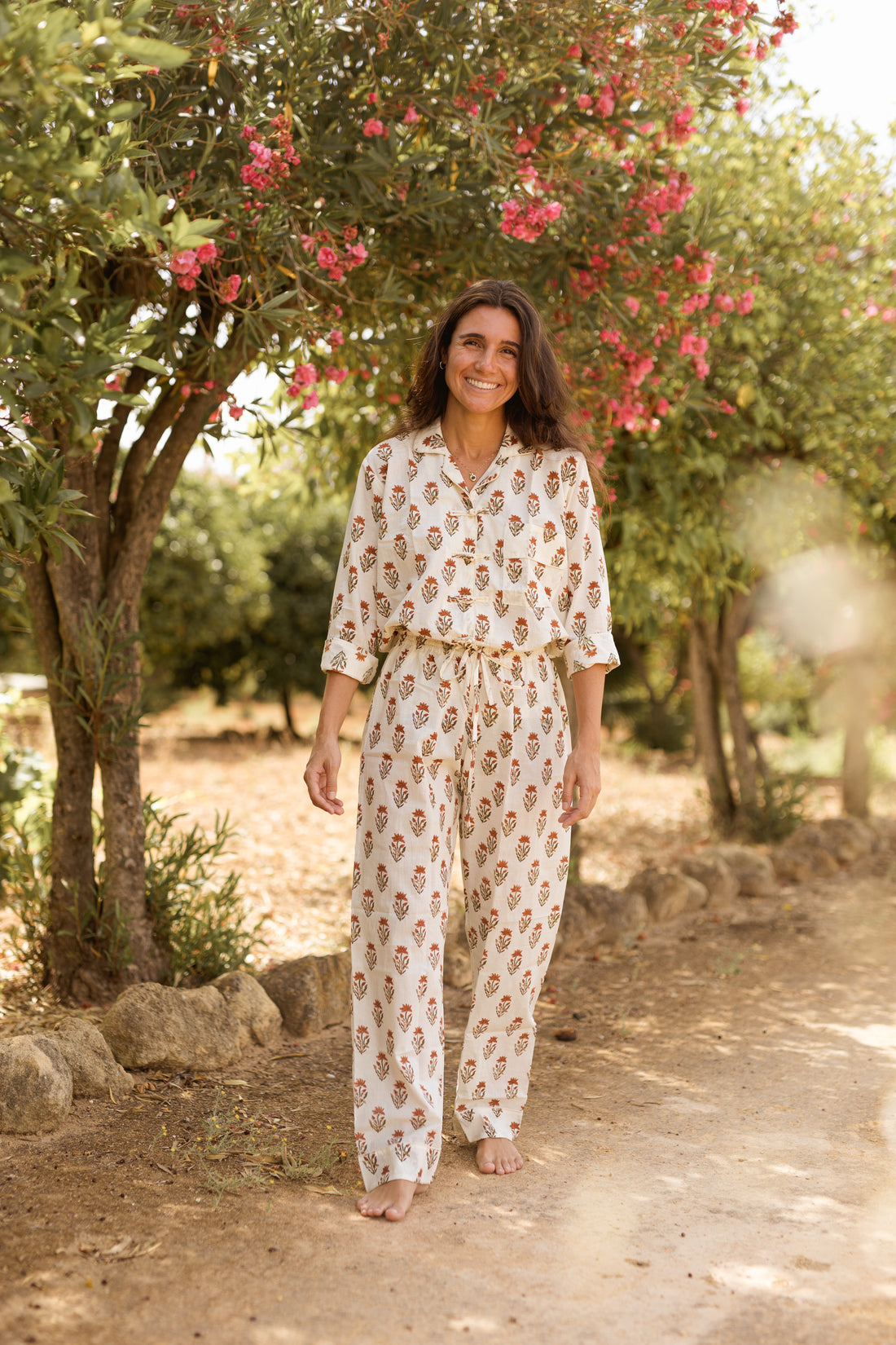 Trabajamos principalmente con algodón 100% y terciopelo de algodón 100%, seleccionados por su calidad, suavidad y ligereza. Muchos de nuestros estampados se crean mediante la técnica block print, una de las formas más tradicionales de estampación en la India.