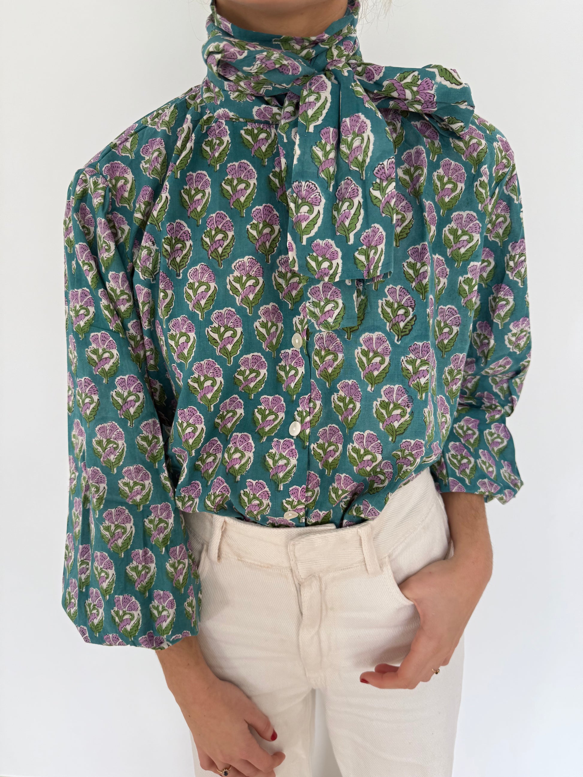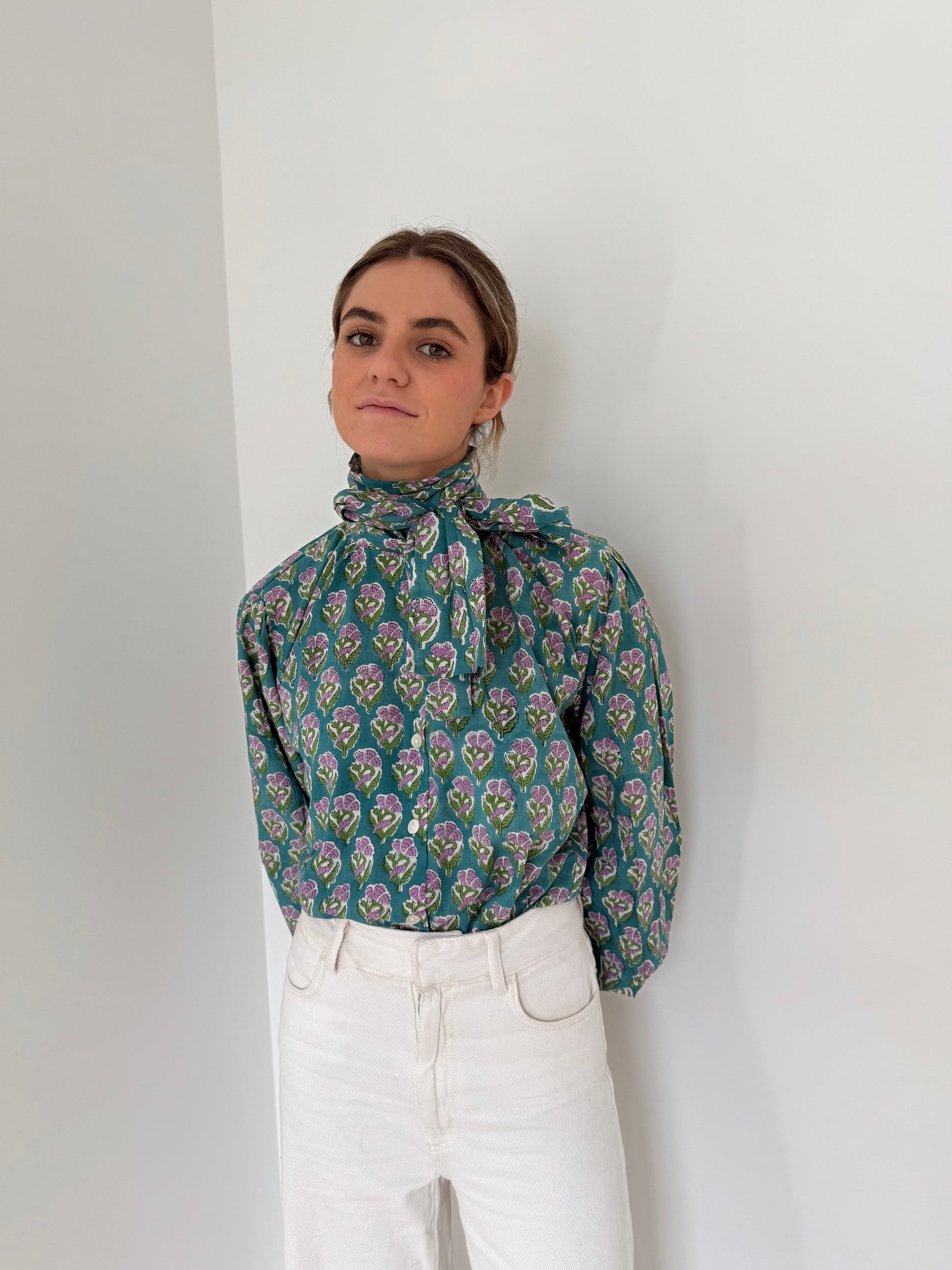 Long-sleeved printed shirt with a bow detail at the neck in brown tones. Perfect for winter days and elevates any look. It stands out for its 100% cotton, in this case ikat. Since the fabric is handmade with natural dyes, it may have some paint stains that are not considered a defect. We create unique, handcrafted pieces.