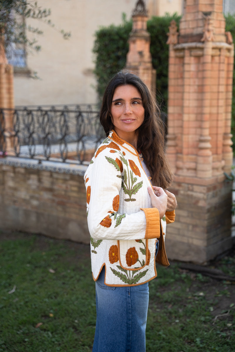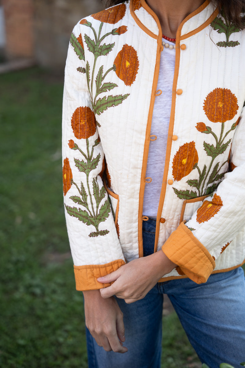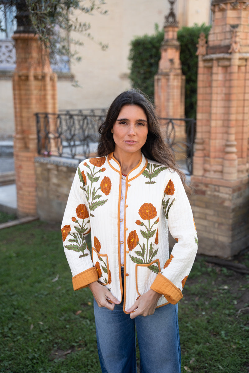 Reversible cotton jacket with two pockets . Each size corresponds to the equivalents mentioned above. The model is 160 cm tall and is wearing size S (runs slightly small).