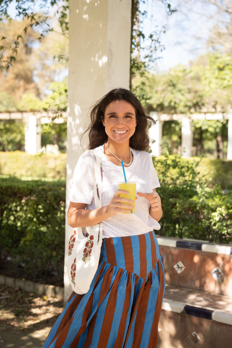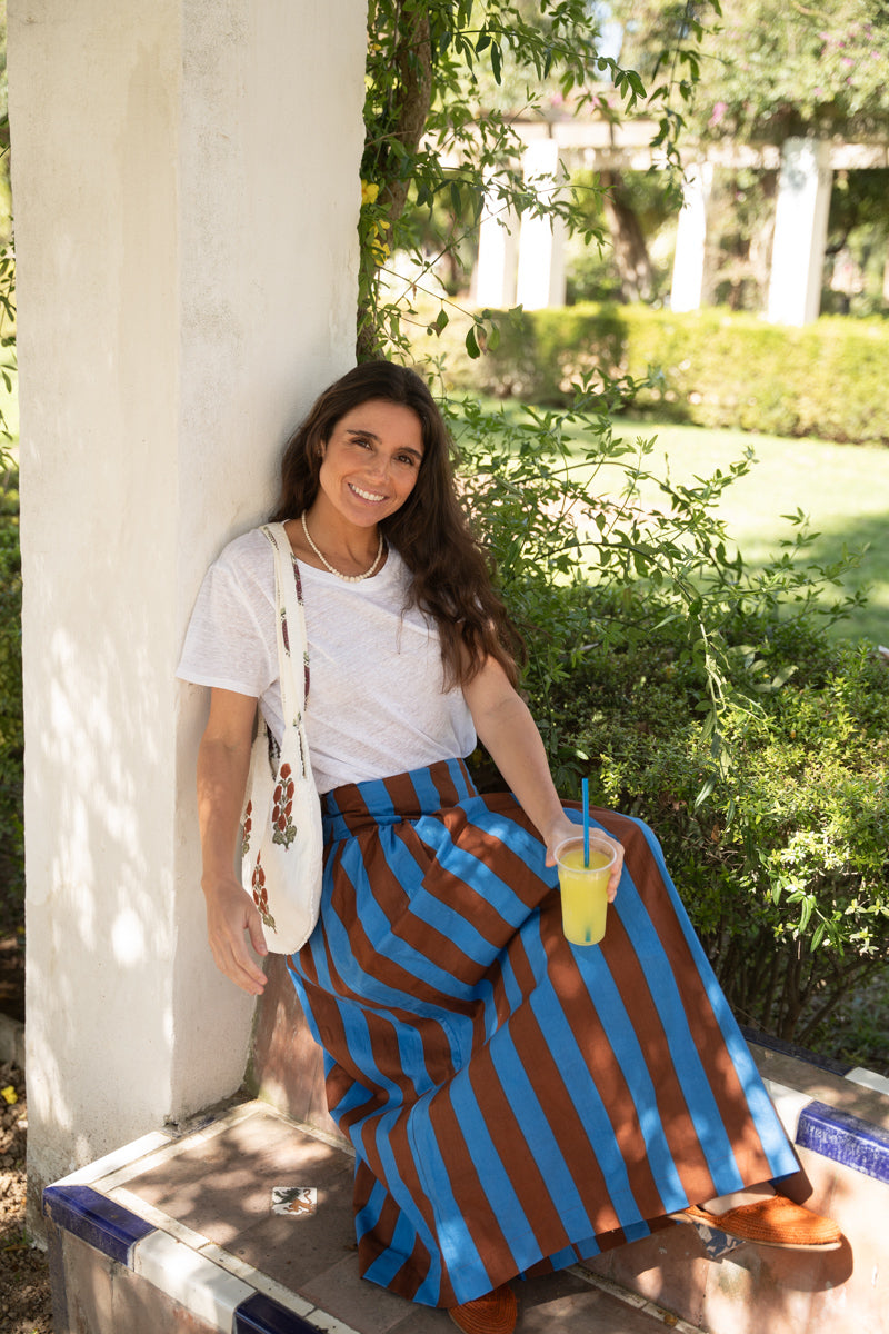 Long skirt in printed cotton with a high waist and a wide waistband and pleated detail. Since the fabric is handmade with natural dyes, it may have some paint stains, which are not considered defects. We create unique, handcrafted pieces.