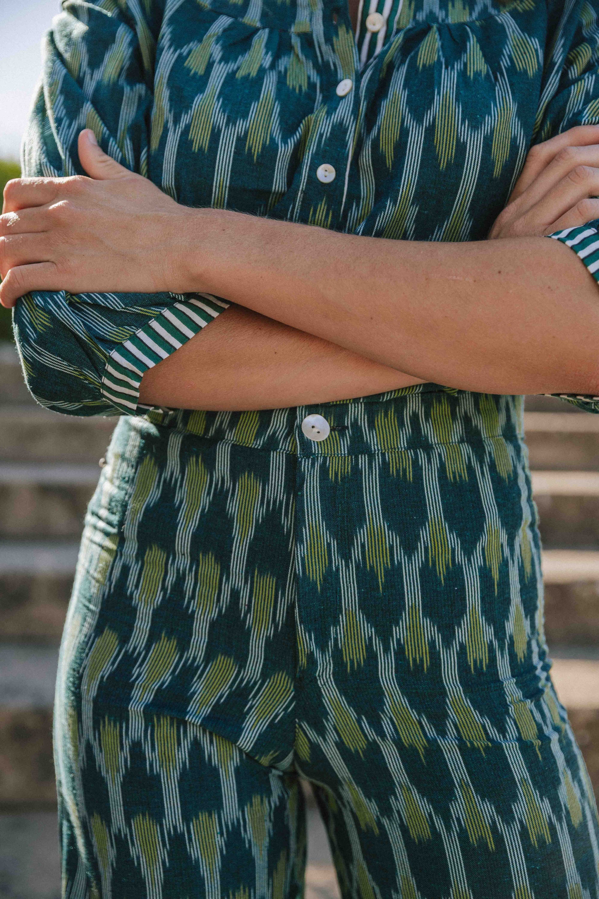 Petrol-printed trousers with natural dyes. Closure by zipper hidden by flap and button . Since the fabric is handmade with natural dyes, it may have some paint stains, which are not considered defects. We create unique, handcrafted pieces.