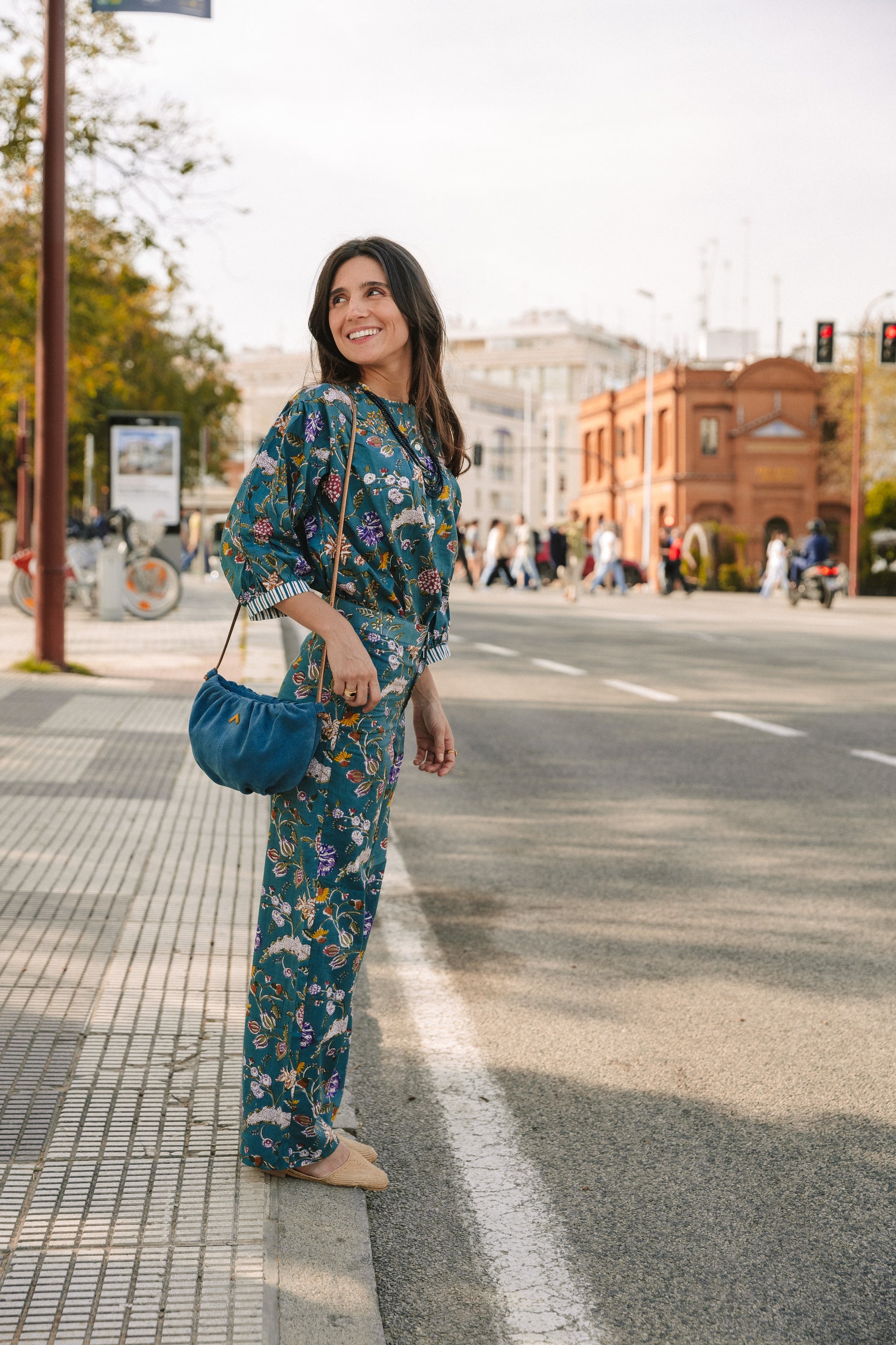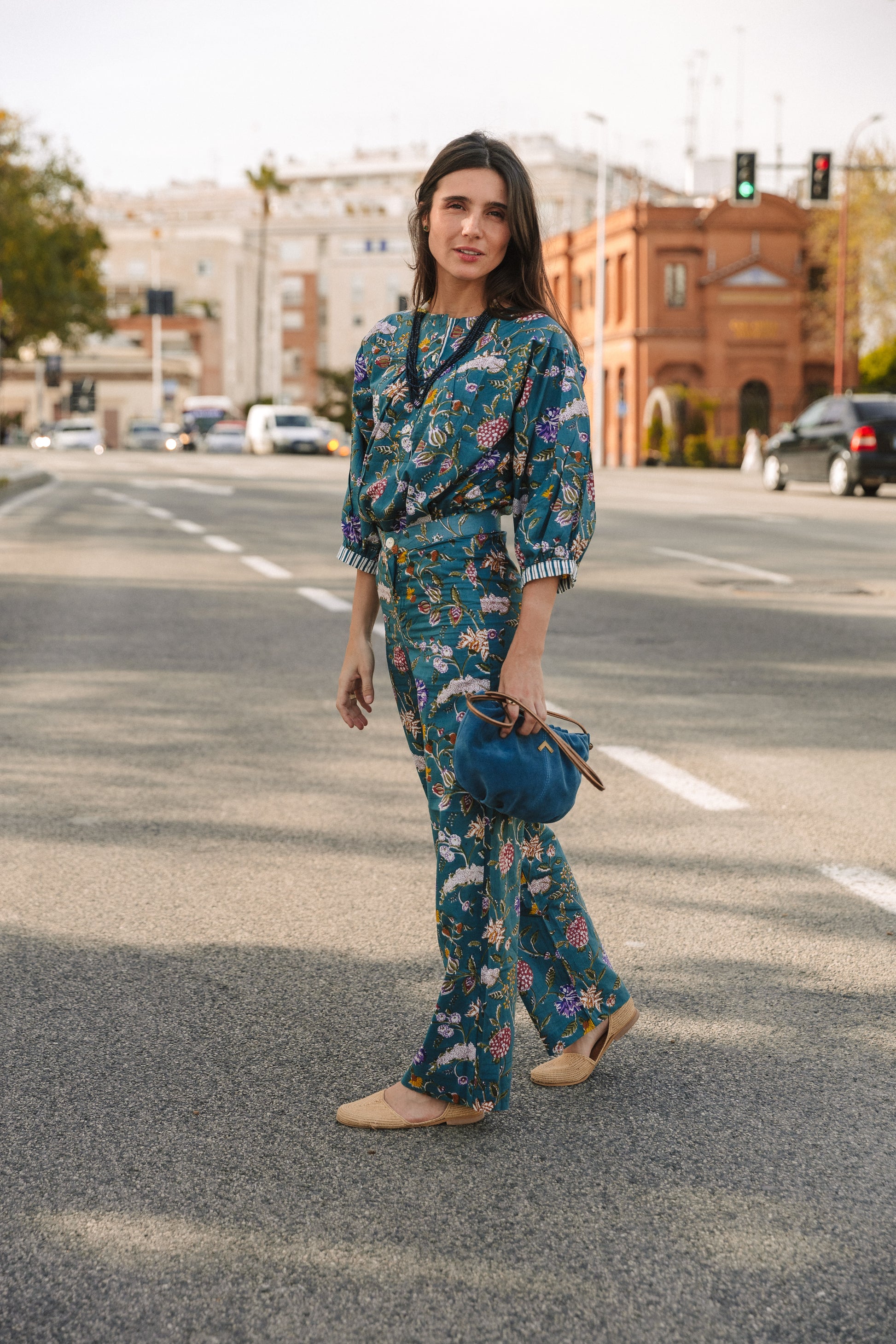 Petrol-printed trousers with natural dyes. Closure by zipper hidden by flap and button . Since the fabric is handmade with natural dyes, it may have some paint stains, which are not considered defects. We create unique, handcrafted pieces.