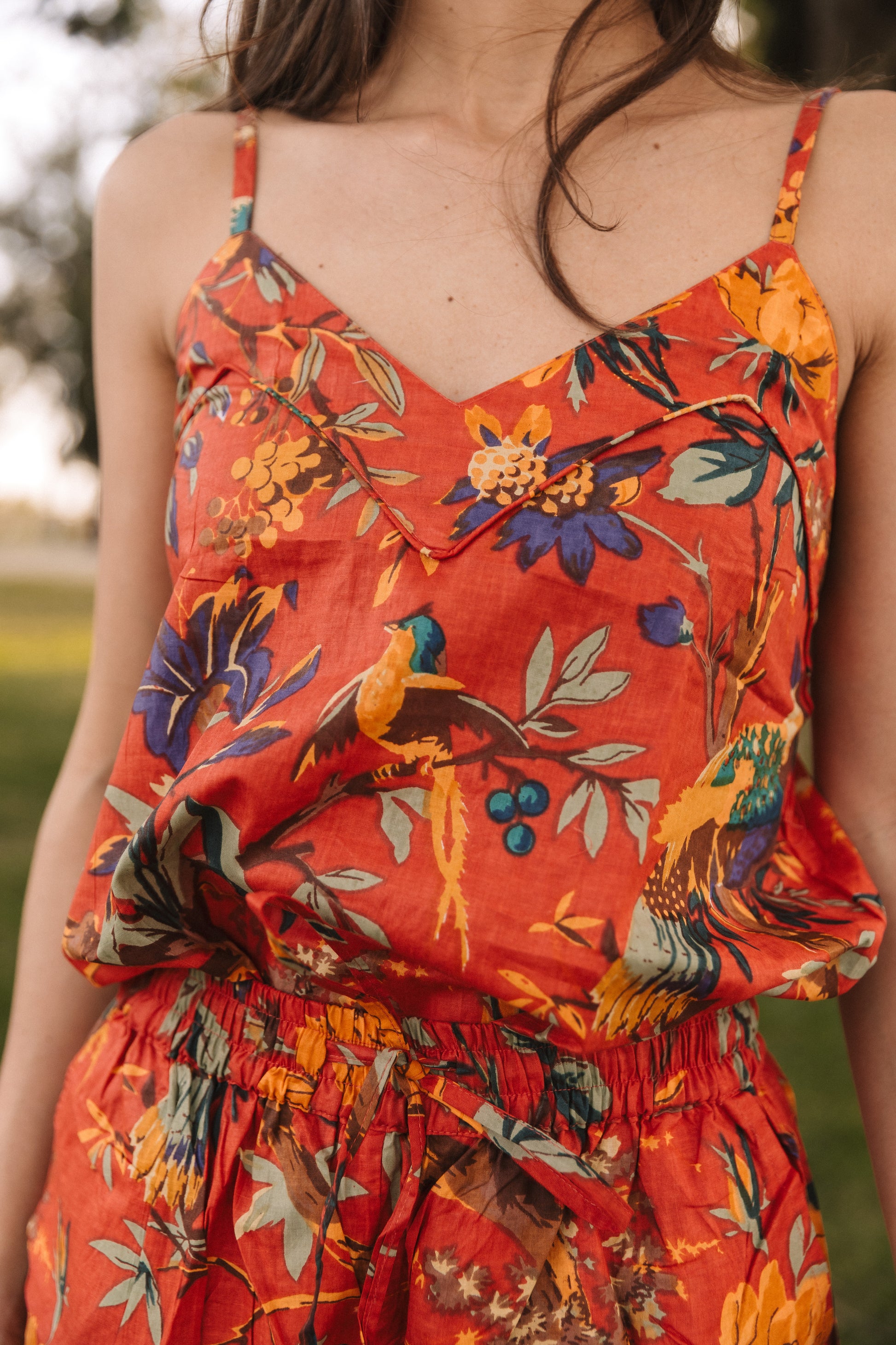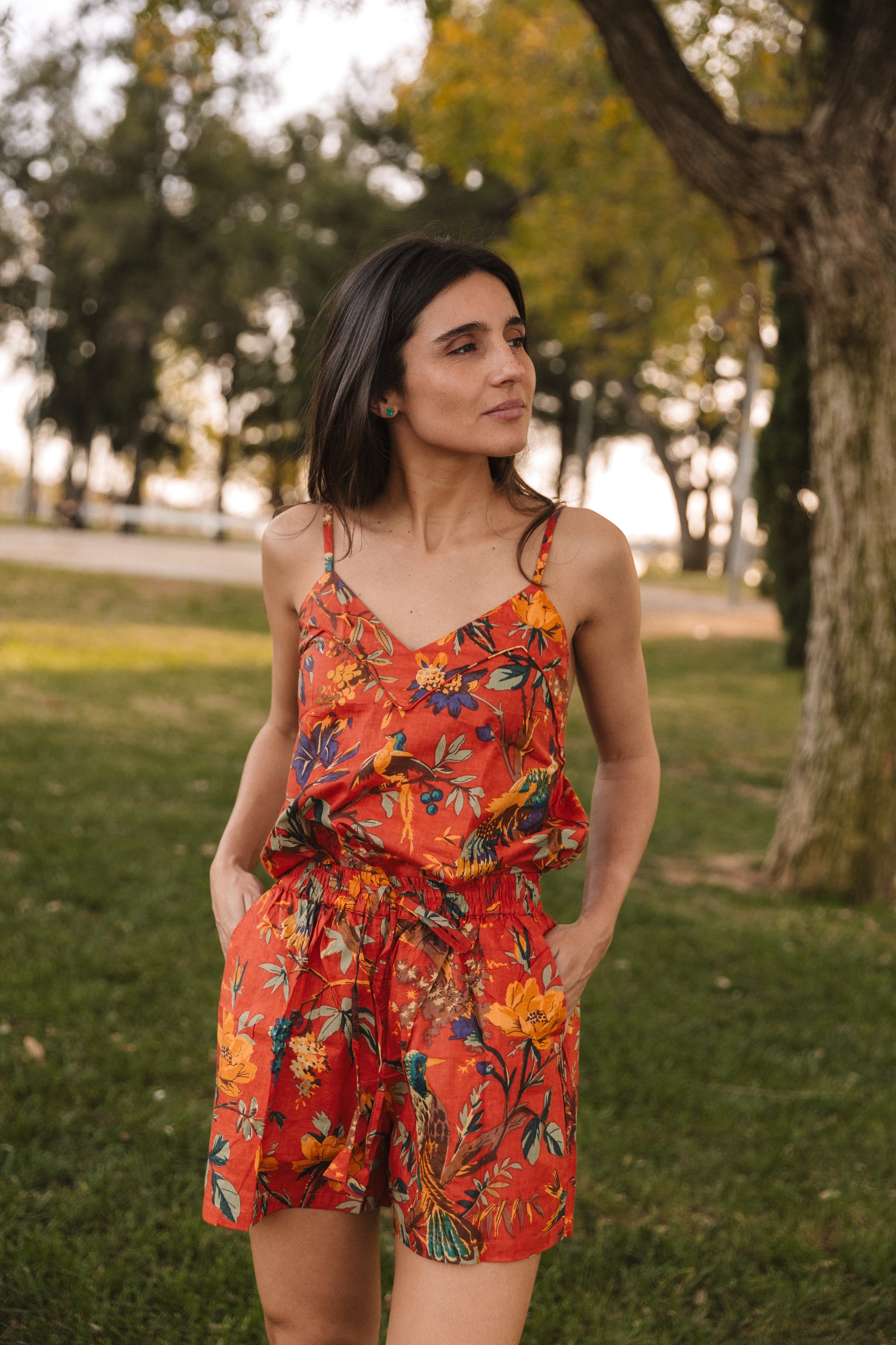 Printed pajamas made of 100% cotton. Camisole with straps and two side pockets on the shorts. Elastic waistband. Made of 100% cotton, the various prints are created using the blockprint technique, which uses carved wooden stamps and natural dyes. It is one of the most traditional techniques originating in India. Since the fabric is handmade with natural dyes, it may have some paint stains that are not considered a defect. We create unique, handcrafted pieces.