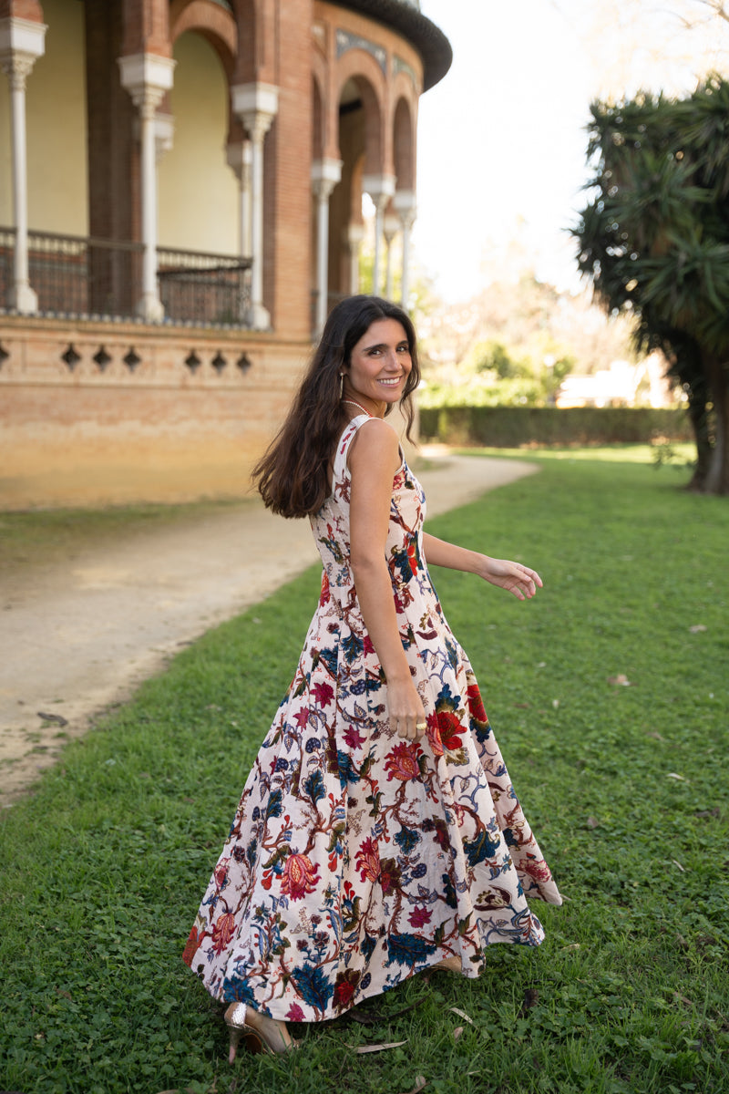 Paneled dress with a corset cut and a square neckline with an A-line skirt. It includes an elastic back for a better fit and a side closure. Made of 100% cotton velvet. The various prints are created using the blockprint technique, which uses carved wooden stamps and natural dyes. It is one of the most traditional techniques originating in India. As the fabric is handmade with natural dyes, it may have some paint stains that are not considered defects. We create unique, handcrafted pieces.