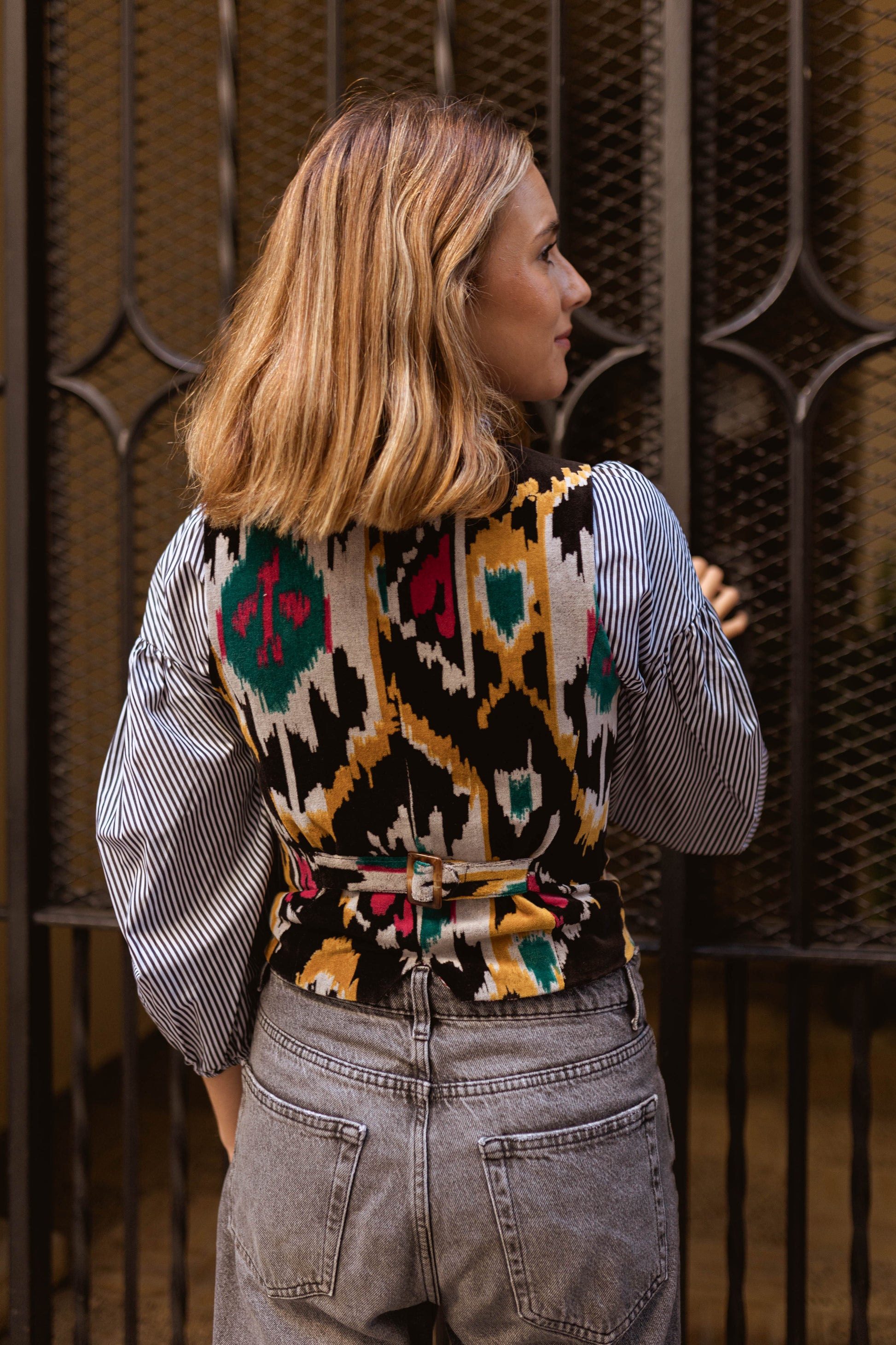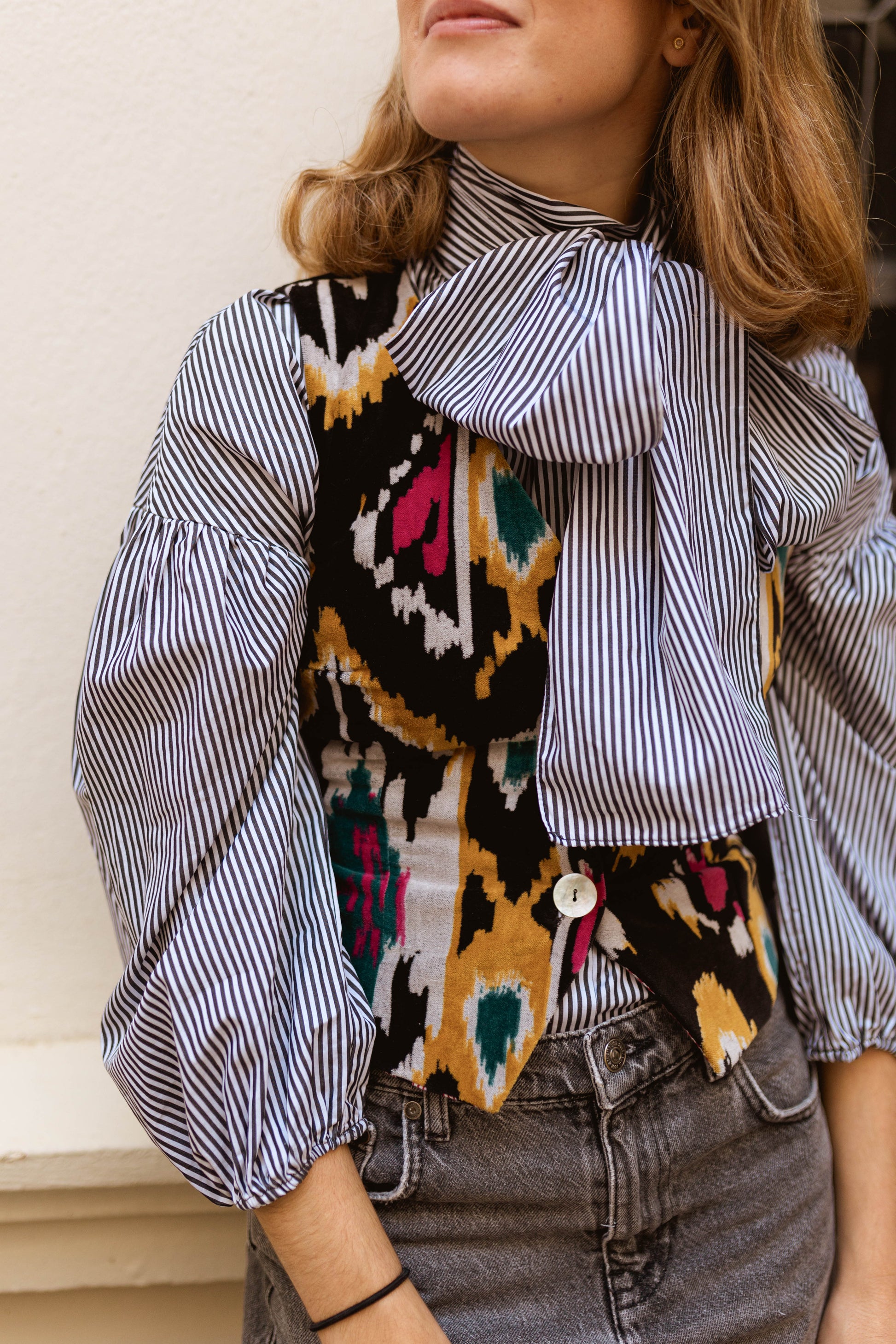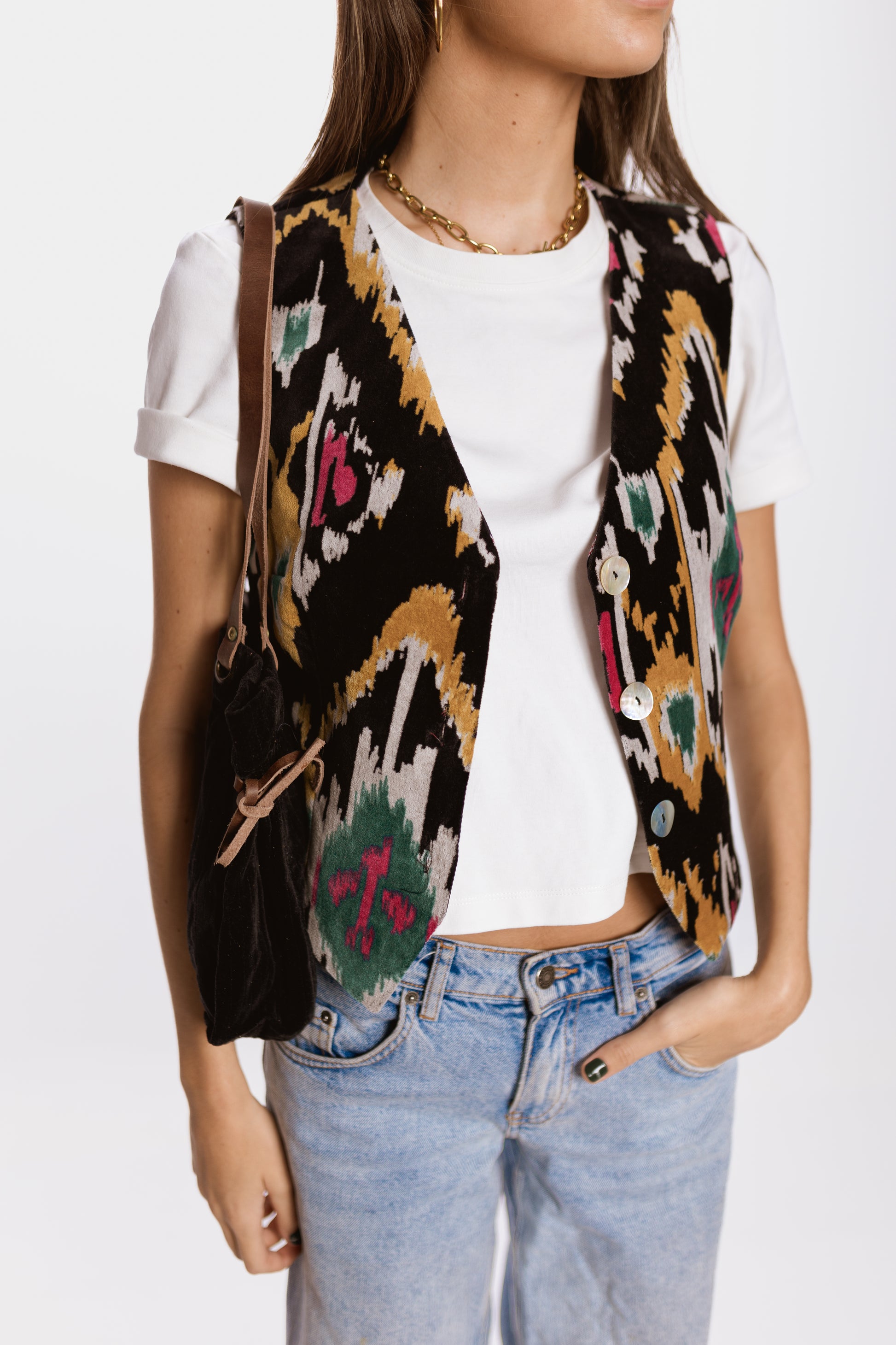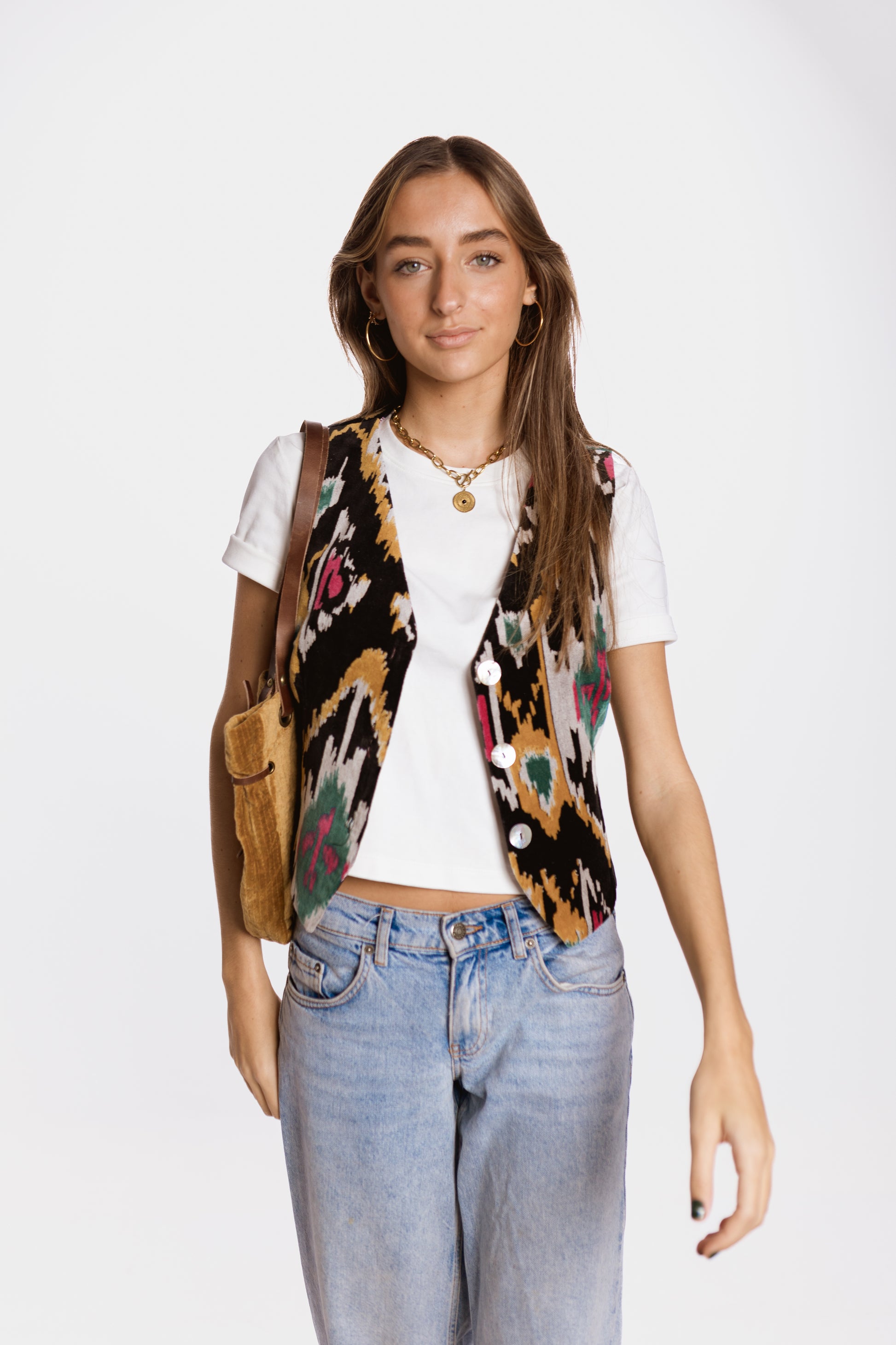 Gilet en velours imprimé velours avec doublure en coton à l'intérieur. Étant donné que le tissu est fabriqué à la main avec des colorants naturels, il peut présenter quelques taches de peinture qui ne sont pas considérées comme un défaut. Le mannequin mesure 1,60 cm et porte la taille XS.