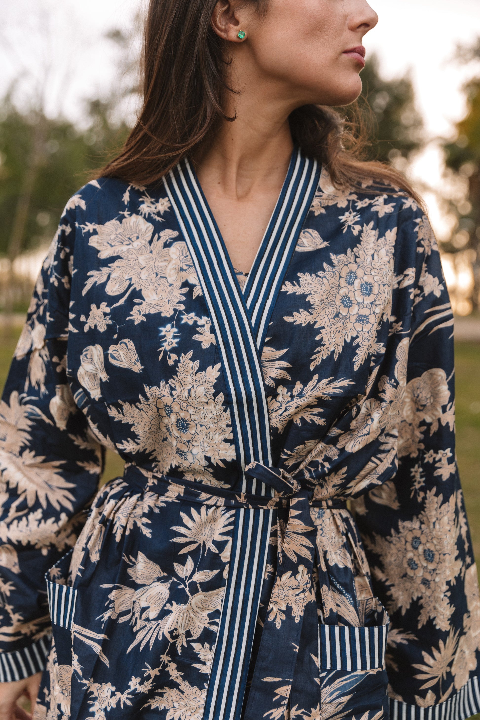 Kimono – Robe imprimée 100% coton. Ceinture et deux poches. Il se distingue par le fait qu'il est 100% coton, les différents imprimés sont créés à l'aide de la technique du blockprint, qui est réalisée avec des tampons en bois sculptés et des colorants naturels. C'est l'une des techniques les plus traditionnelles originaires d'Inde. Étant donné que le tissu est fabriqué à la main avec des colorants naturels, il peut présenter quelques taches de peinture qui ne sont pas considérées comme un défaut. Nous créons des pièces uniques et artisanales. Taille unique. Le modèle mesure 1,60 m.