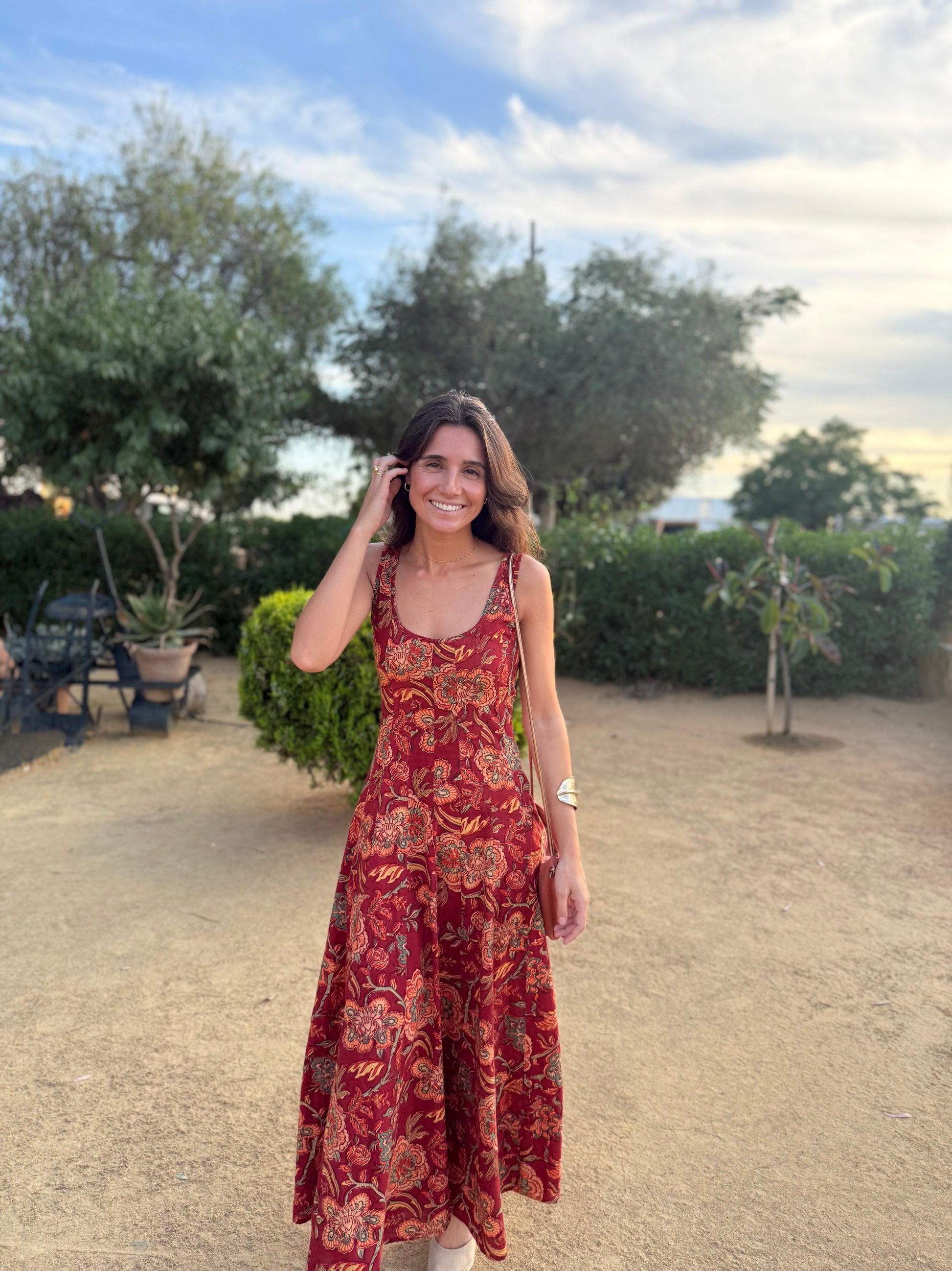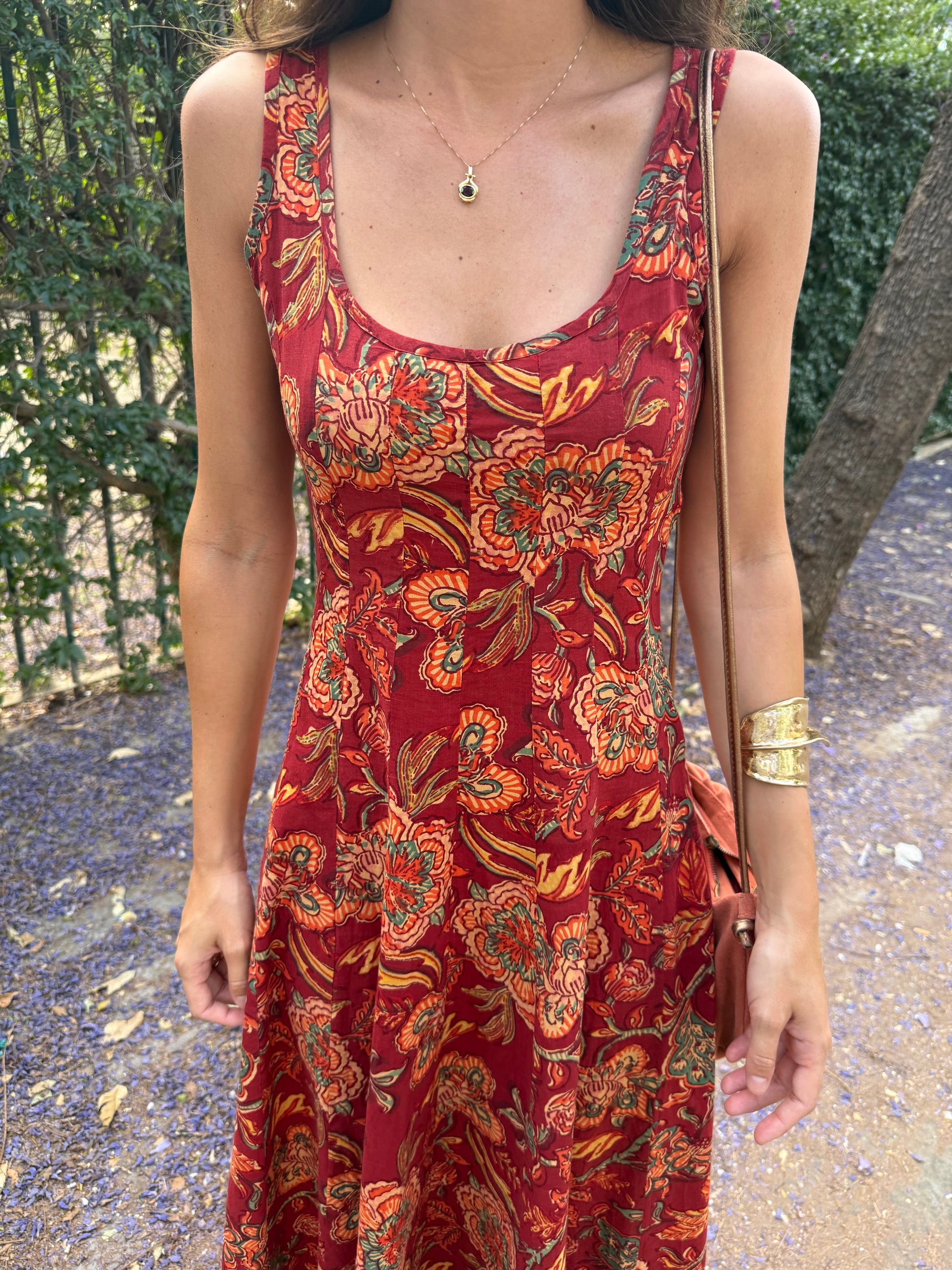 Robe à panneaux avec une coupe corset et un décolleté carré en haut avec une jupe trapèze. Comprend un dos élastique pour un meilleur ajustement et une fermeture latérale. Fabriqué en velours 100% coton. Nous réalisons les différentes impressions en utilisant la technique du blockprint, qui est réalisée avec des tampons en bois sculptés et des colorants naturels. C'est l'une des techniques les plus traditionnelles originaires d'Inde. Étant donné que le tissu est fabriqué à la main avec des colorants naturels, il peut présenter quelques taches de peinture qui ne sont pas considérées comme un défaut. Nous créons des pièces uniques et artisanales.