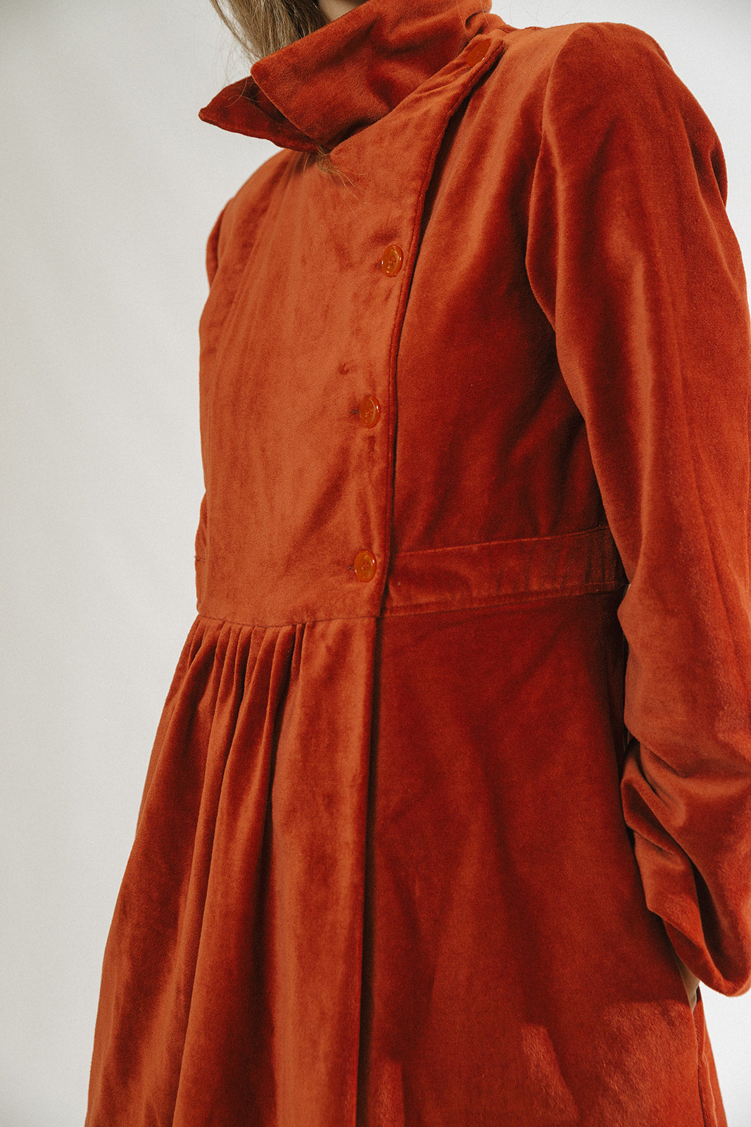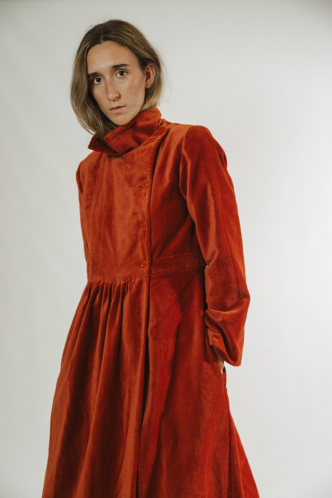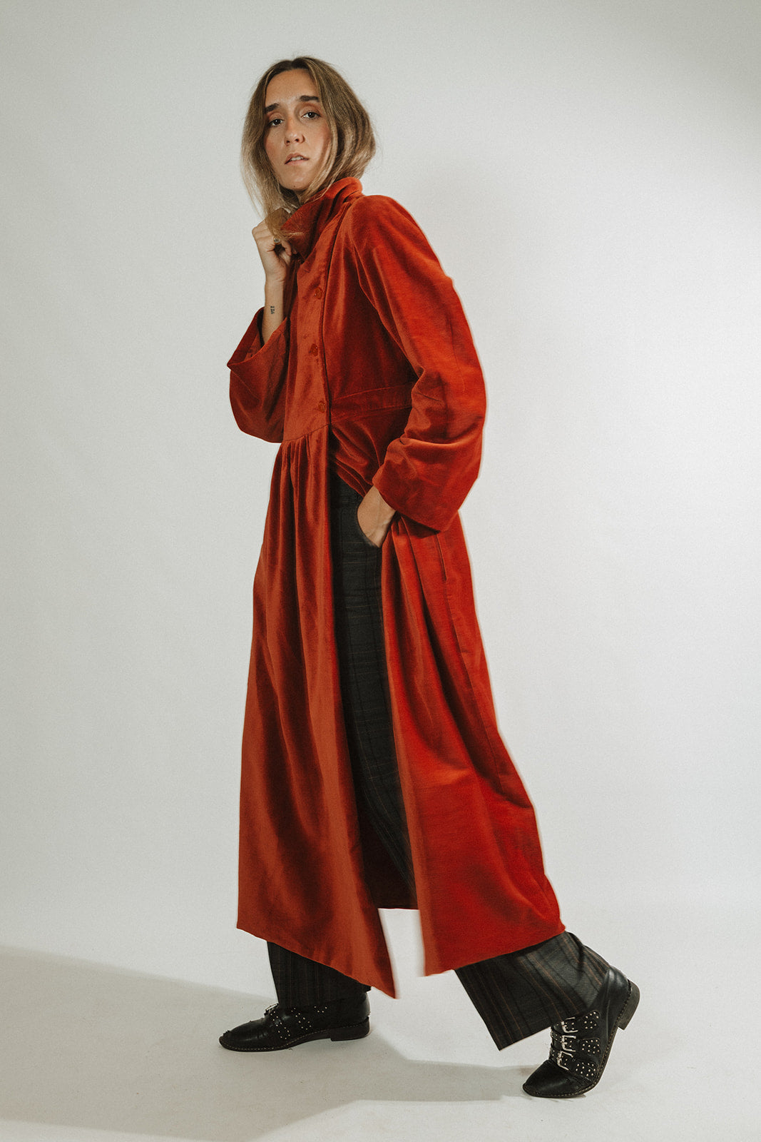 Abrigo largo en terciopelo de algodón 100%. Este abrigo cuenta con botones en el lateral y frunce en la cintura y en la espalda. Forro interior del mismo color en algodón.