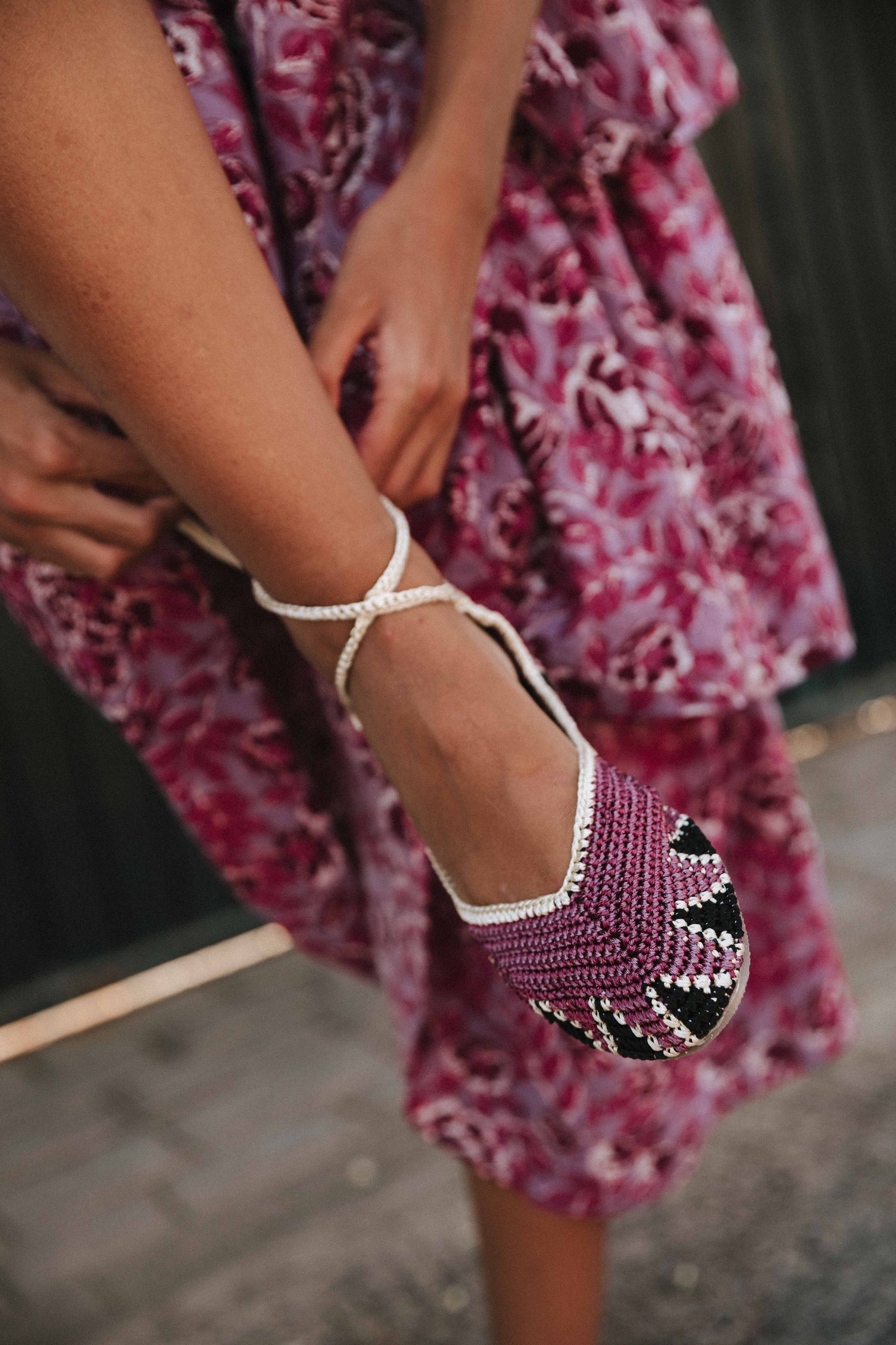 Bailarina artesanal de crochet con tiras multicolor en magenta, negro y beige. Tejidas en punto, puntera redonda, interior de cuero, suela de cuero y goma.
