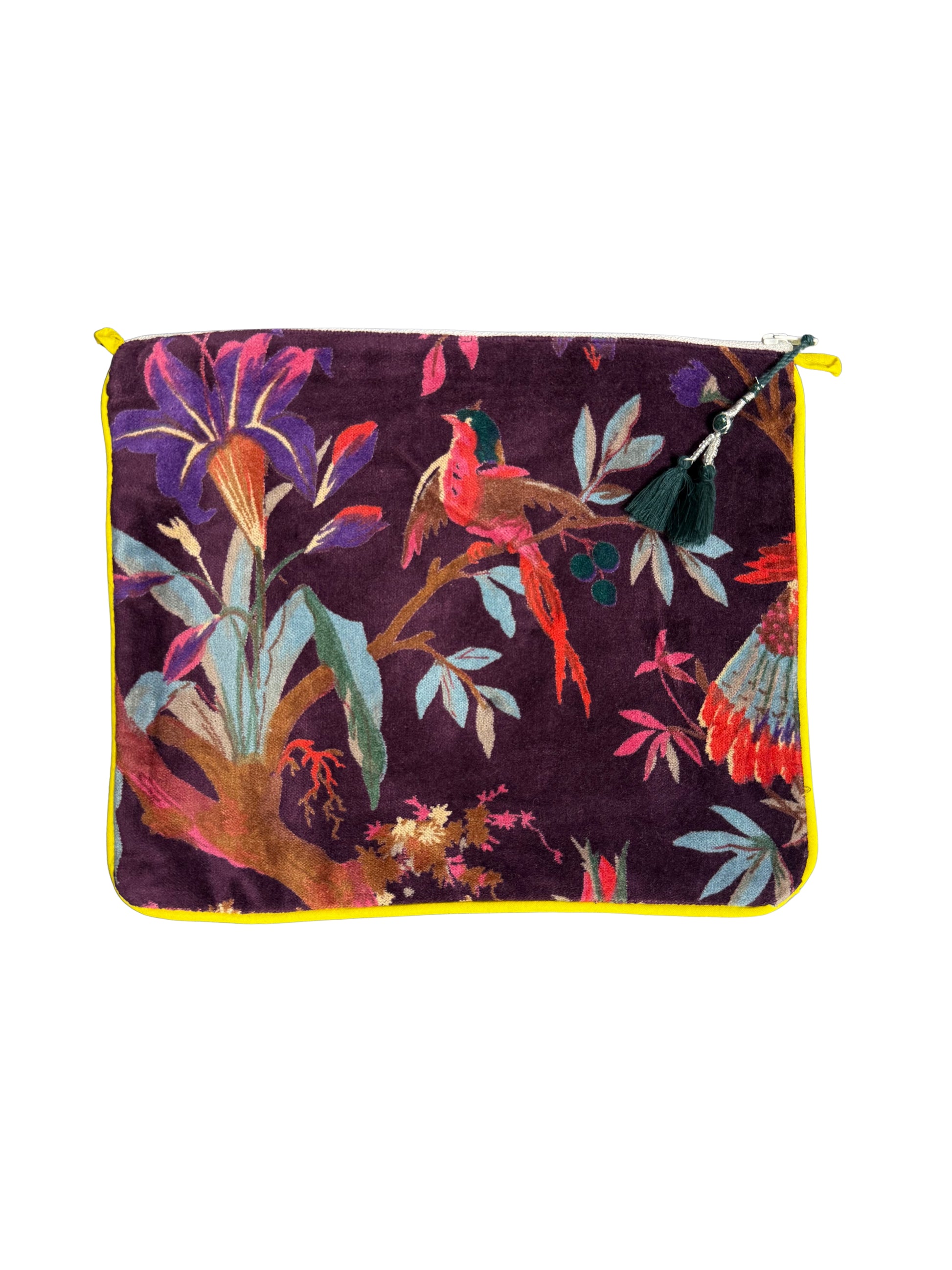 Bolso de mano de terciopelo con estampado. Cierre superior con cremallera y borlón decorativo. El color del vivo puede variar, no siempre es igual.