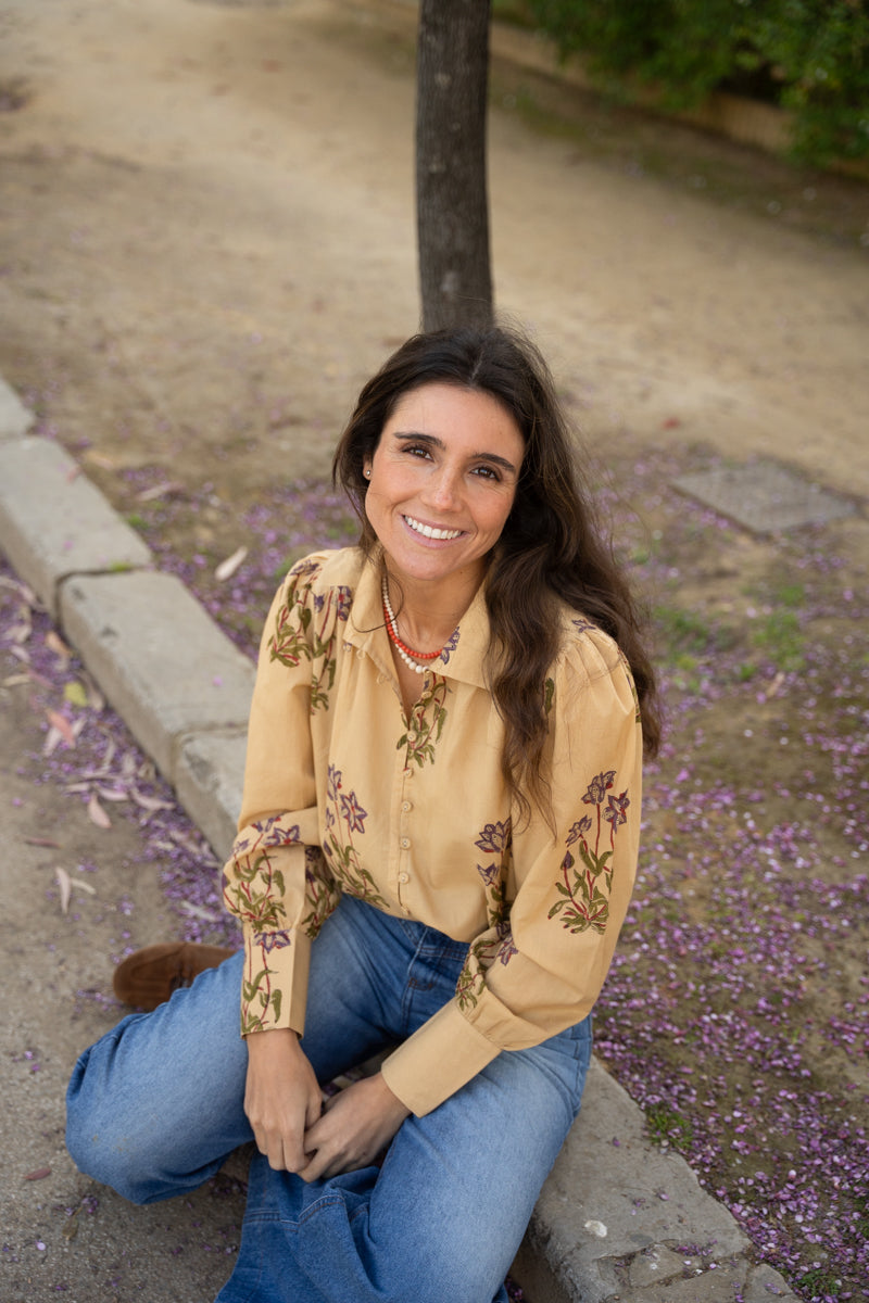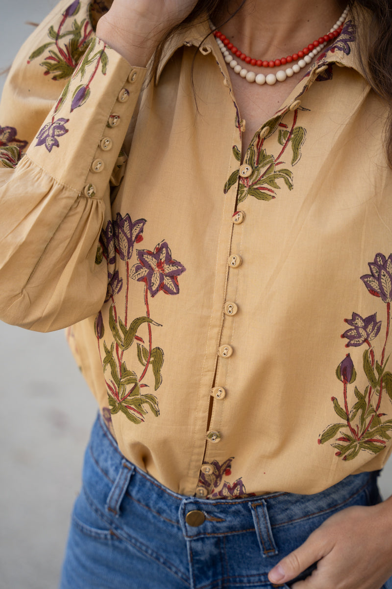 Camisa estampada en tonos beige y morada con manga larga bombacha acabada en puño y cierre delantero de botones revestidos. Perfecto para días de invierno y eleva cualquier look. Destaca por ser 100% algodón. Al ser la tela hecha a mano con tintes naturales, puede presentar alguna mancha de pintura que no es considerado defecto. Creamos piezas únicas y artesanales.