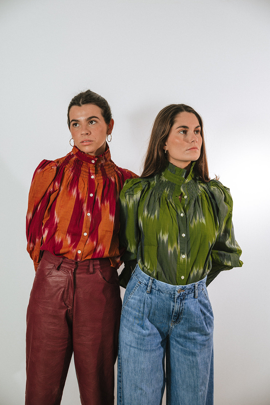 Camisa de algodón con estampado ikat con detalle en el cuello fruncido y mangas largas abullonadas con puño fruncido en tonos berenjena y naranja. Cierre delantero con botones. Destaca por ser 100% algodón. Al ser la tela hecha a mano con tintes naturales, puede presentar alguna mancha de pintura que no es considerado defecto. Creamos piezas únicas y artesanales.