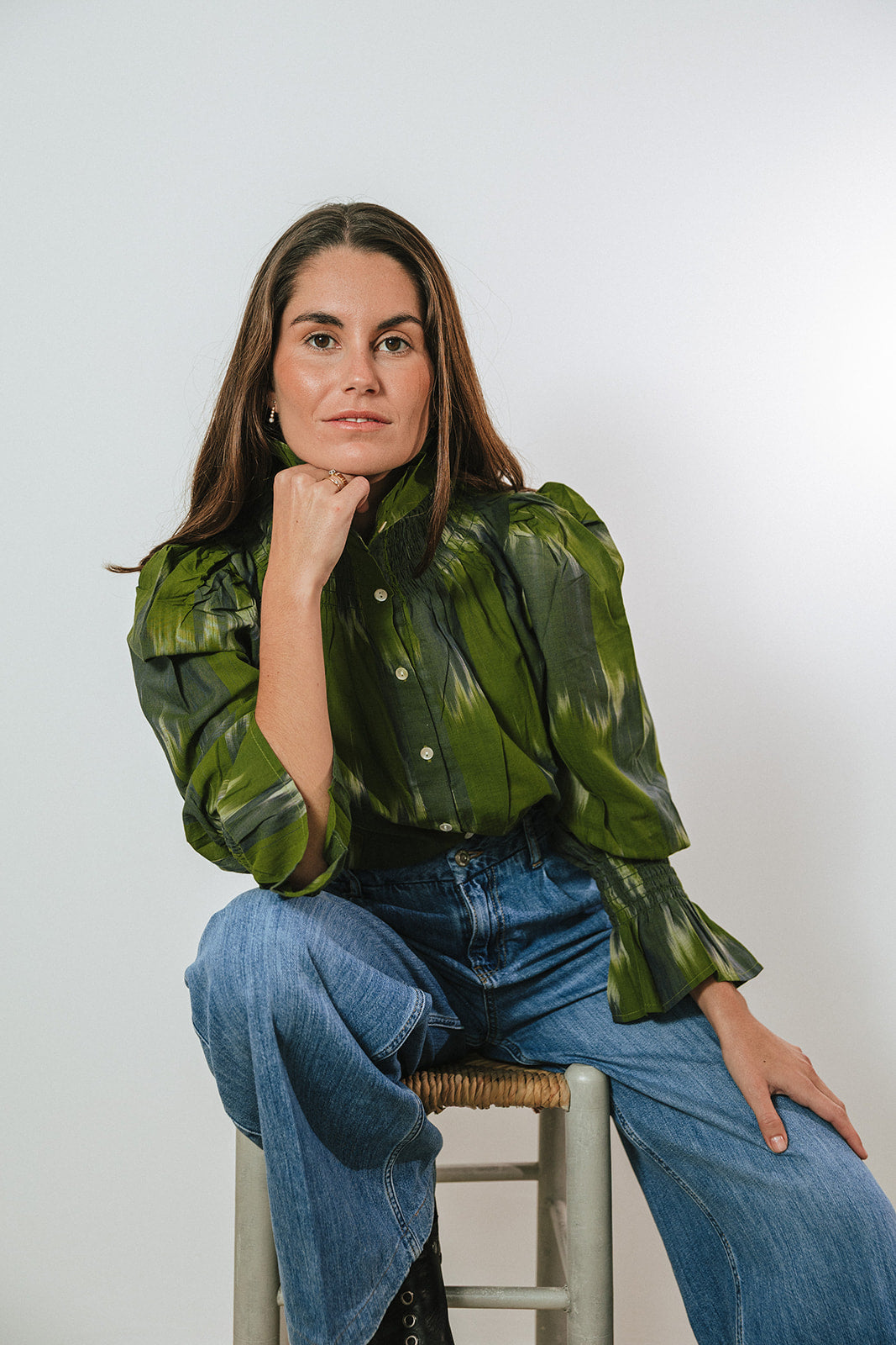 Camisa de algodón con estampado ikat con detalle en el cuello fruncido y mangas largas abullonadas con puño fruncido en tonos verdes. Cierre delantero con botones. Destaca por ser 100% algodón. Al ser la tela hecha a mano con tintes naturales, puede presentar alguna mancha de pintura que no es considerado defecto. Creamos piezas únicas y artesanales.