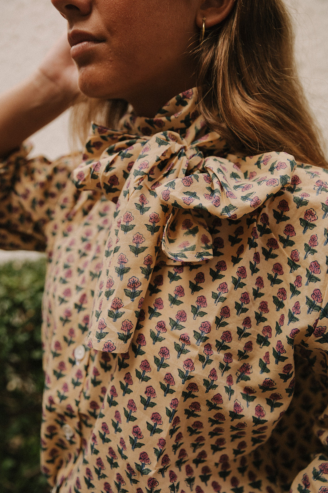 Camisa estampada de manga larga con detalle lazo en el cuello en tonos morado y verde. Perfecta para días de otoño. Destaca por ser 100% algodón estampado. Al ser la tela hecha a mano con tintes naturales, puede presentar alguna mancha de pintura que no es considerado defecto. Creamos piezas únicas y artesanales.