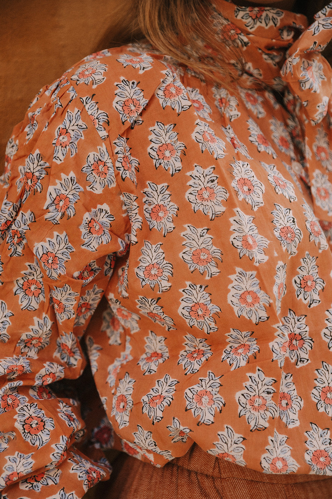 Camisa estampada de manga larga con detalle lazo en el cuello en tonos teja y azules. Perfecta para días de otoño. Destaca por ser 100% algodón estampado. Al ser la tela hecha a mano con tintes naturales, puede presentar alguna mancha de pintura que no es considerado defecto. Creamos piezas únicas y artesanales.