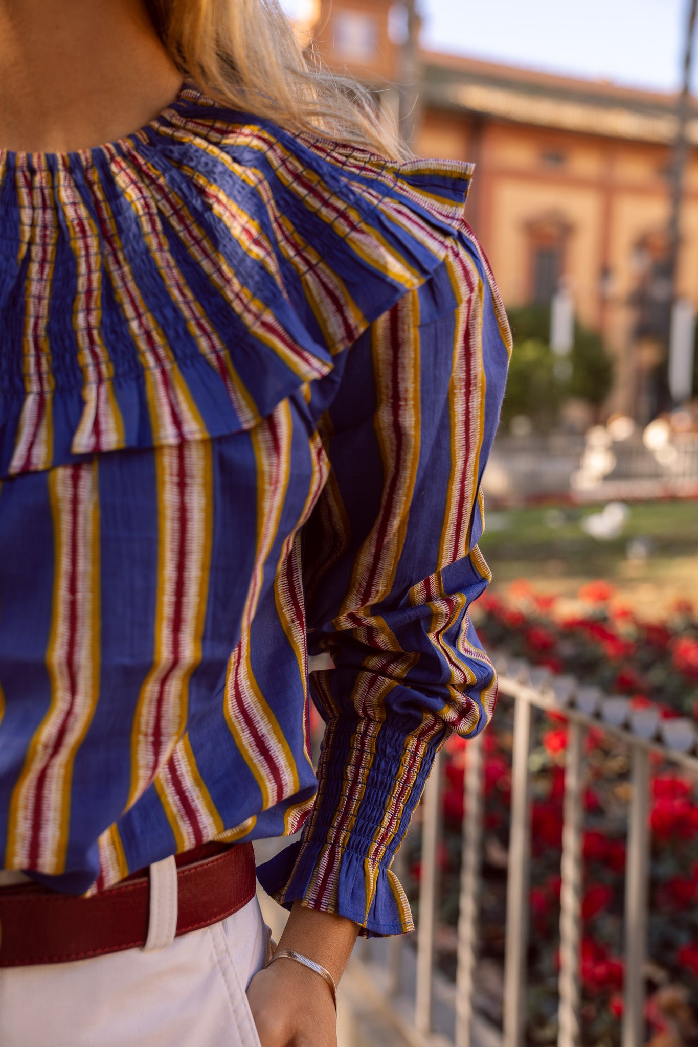 Camisa estampada de manga larga con canesú redondeado de nido de abeja en tonos azul y ocre. Perfecta para días de invierno y otoño. Destaca por ser 100% algodón estampado. Al ser la tela hecha a mano con tintes naturales, puede presentar alguna mancha de pintura que no es considerado defecto. Creamos piezas únicas y artesanales.