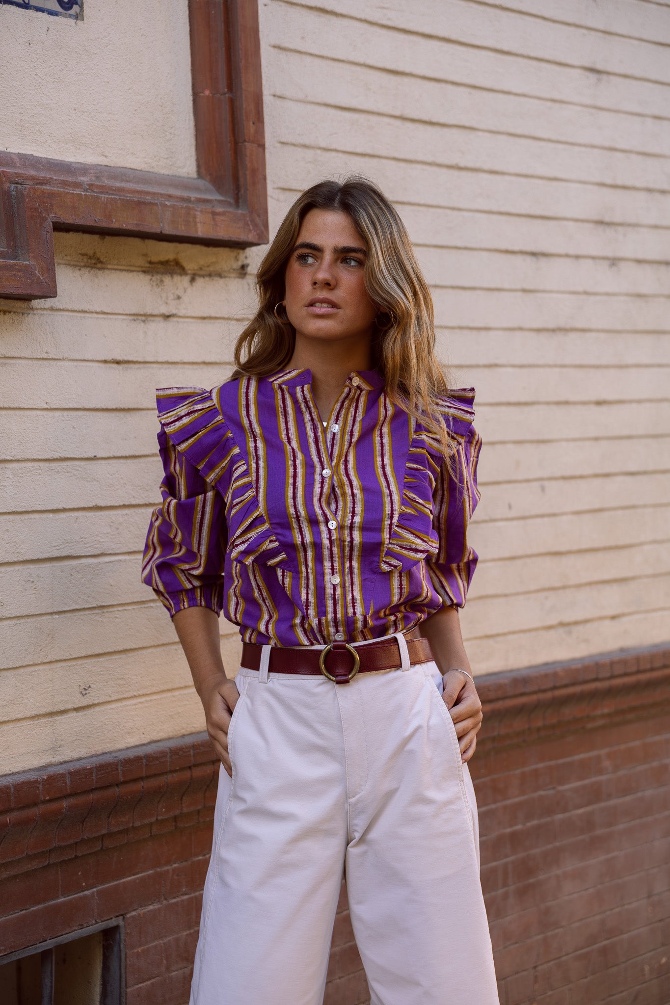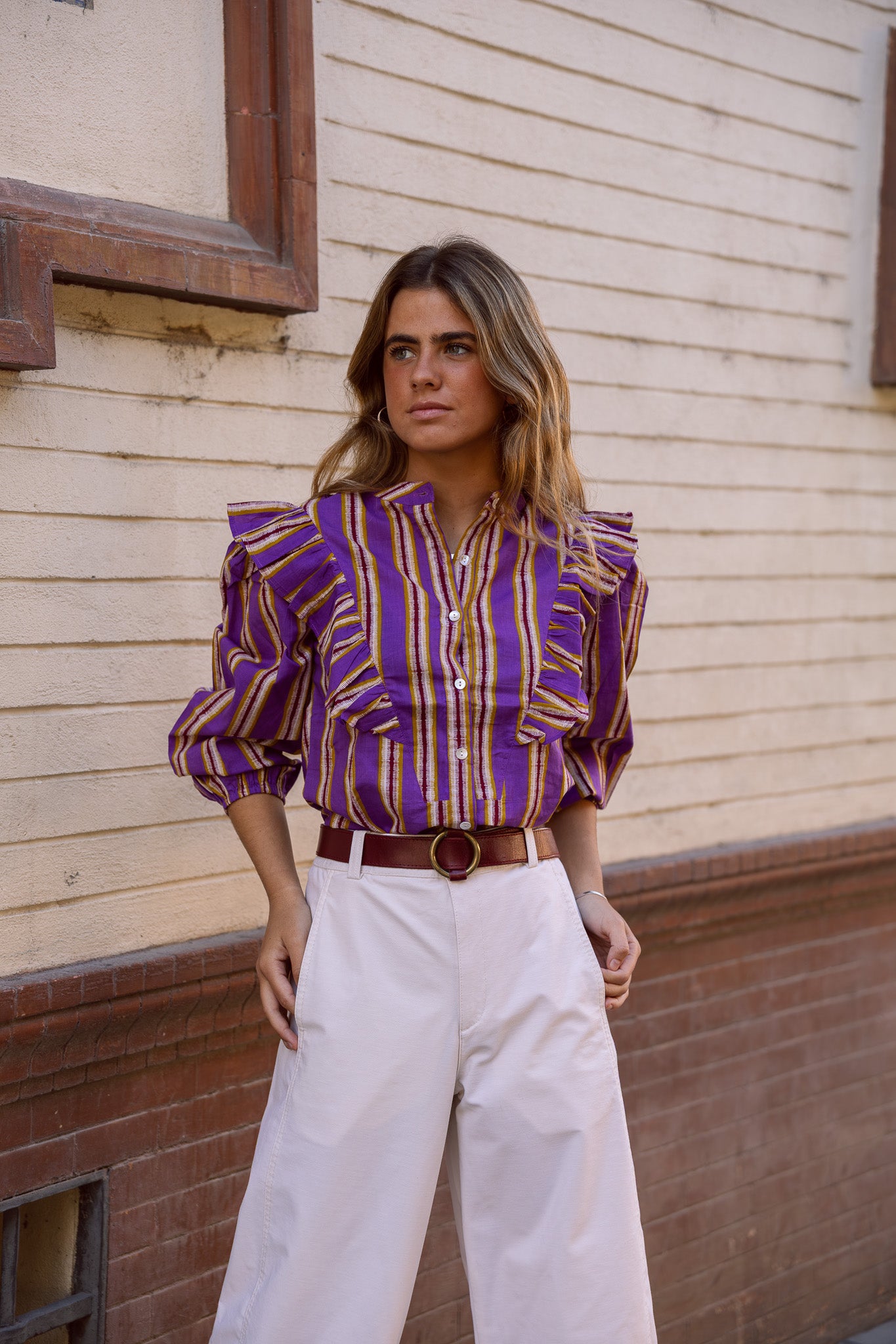Camisa estampada de manga larga con detalle de volante en la parte frontal en tonos malva. Perfecta para días de invierno y otoño. Destaca por ser 100% algodón estampado. Al ser la tela hecha a mano con tintes naturales, puede presentar alguna mancha de pintura que no es considerado defecto. Creamos piezas únicas y artesanales.