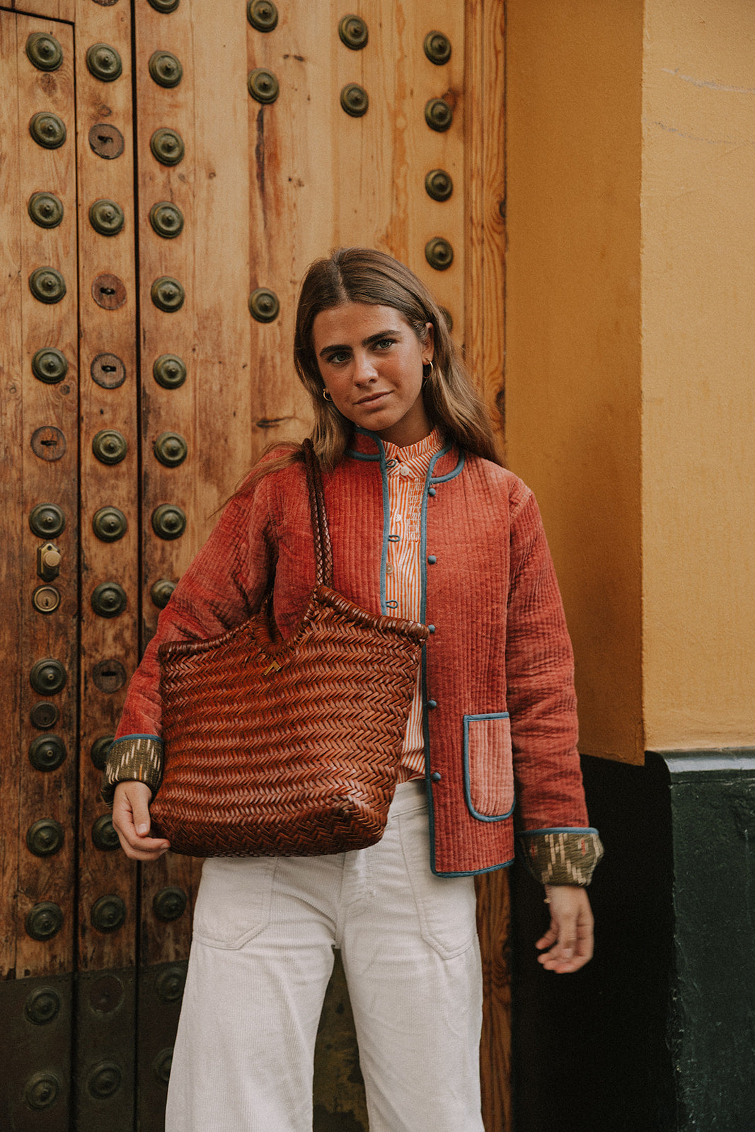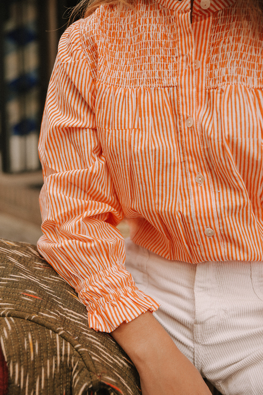 Camisa de rayas con detalle en parte delantera fruncido y mangas largas abullonadas con puño elástico en tonos naranjas. Cierre delantero con botones. Destaca por ser 100% algodón. Al ser la tela hecha a mano con tintes naturales, puede presentar alguna mancha de pintura que no es considerado defecto. Creamos piezas únicas y artesanales.