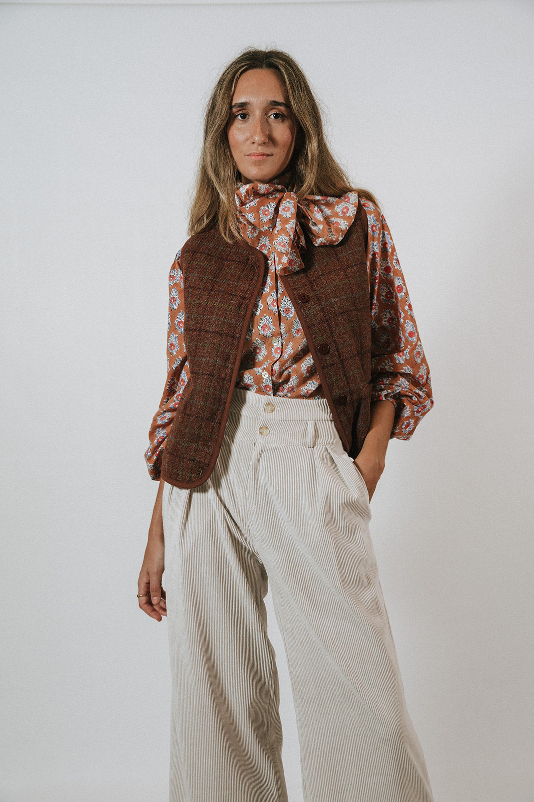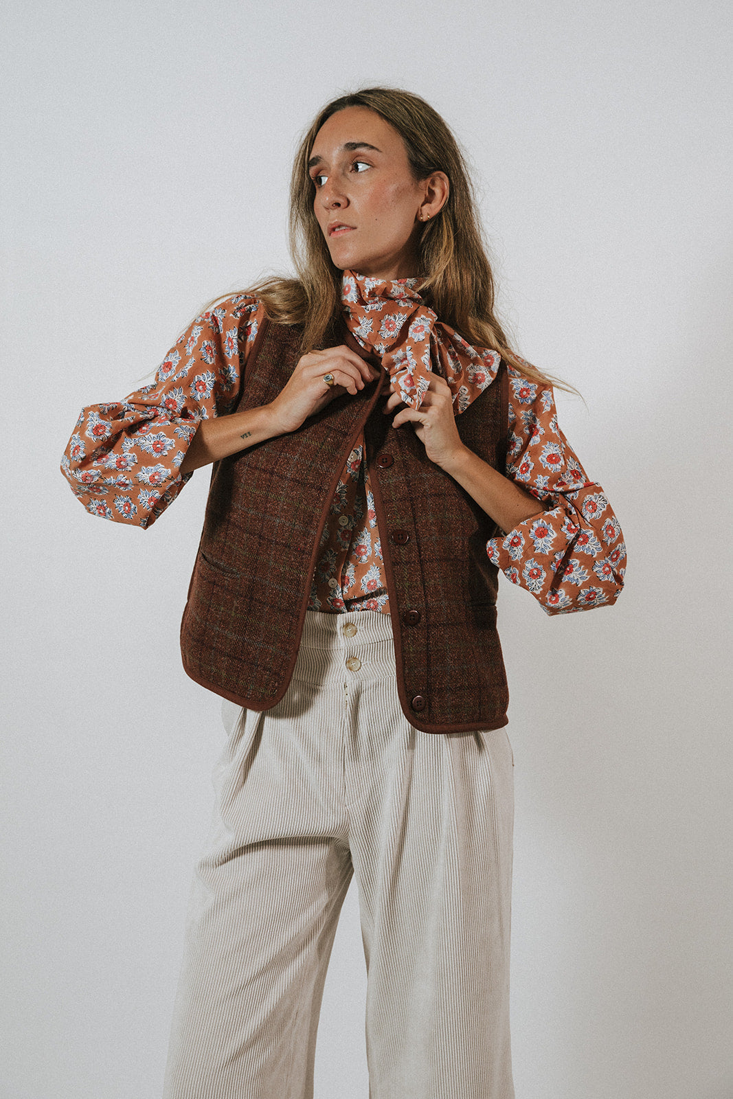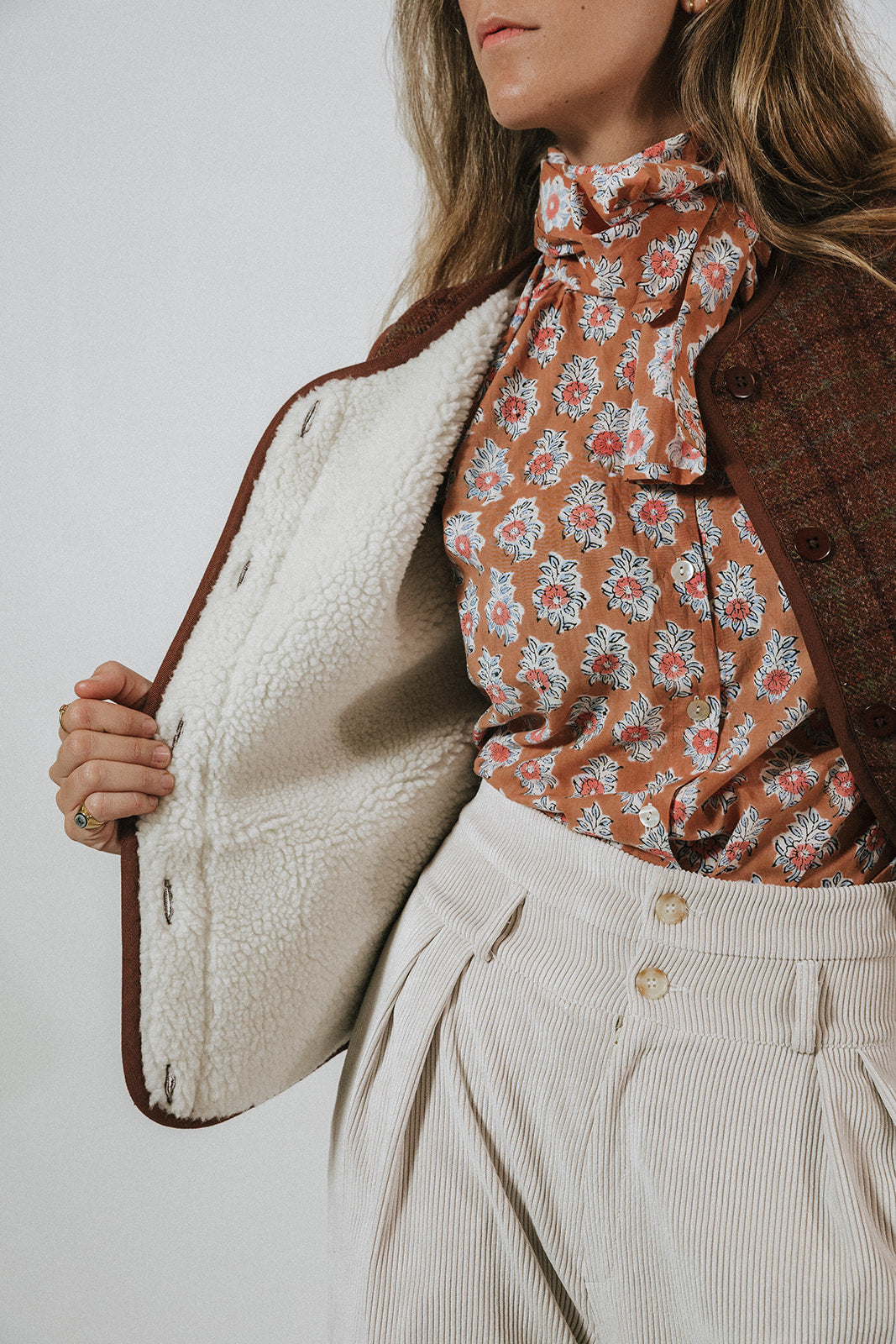 Chaleco oversize en tejido con diseño de cuadros en tonos marrones y caldera, con forro de borreguito y botones delanteros.