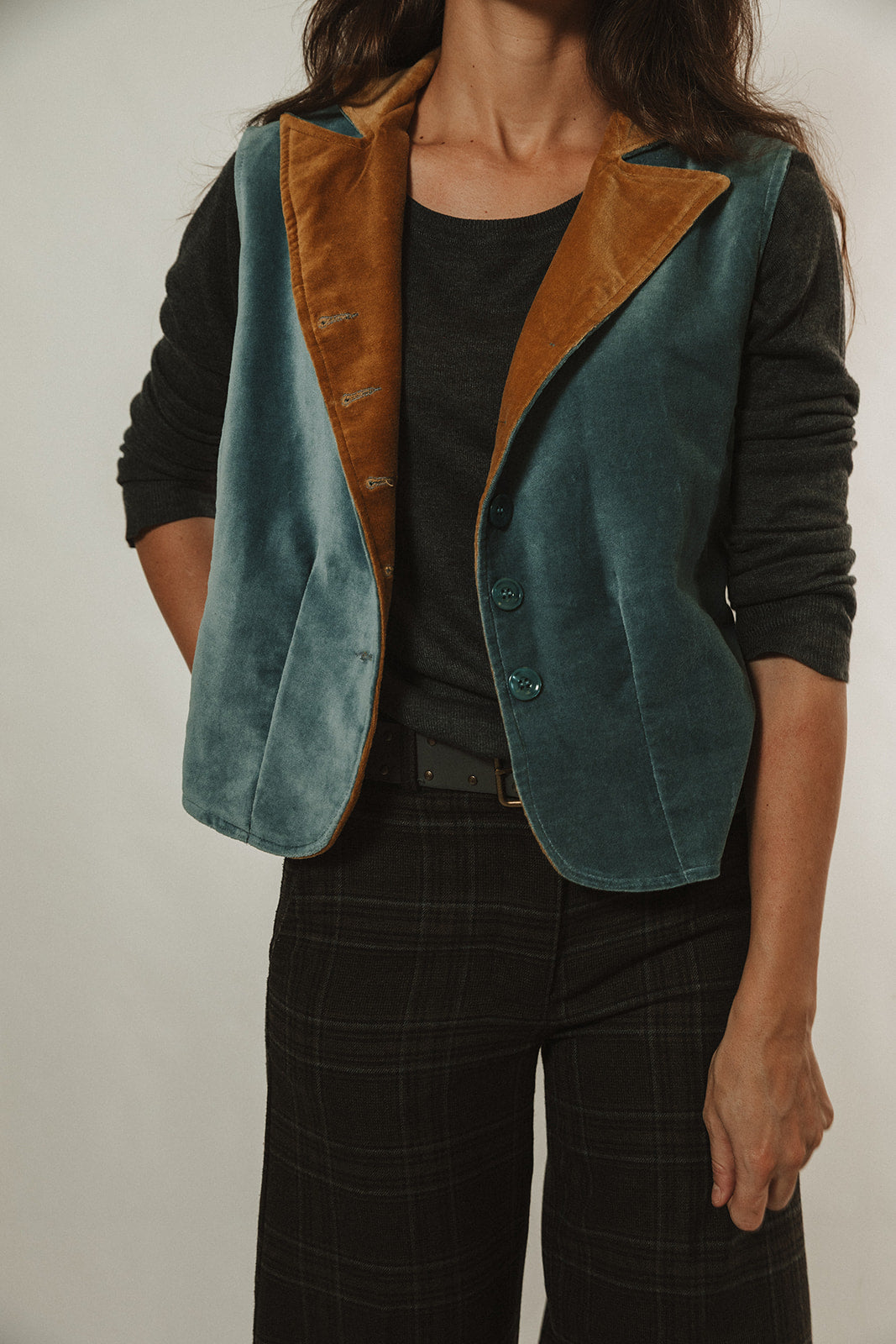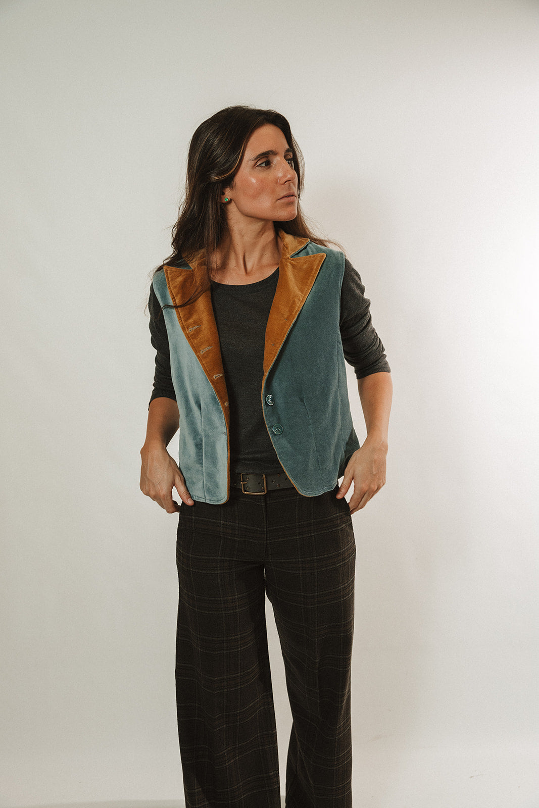 Chaleco de terciopelo escote pico con contraste de color. Cierre con botones en la parte delantera y forro interior. Cada talla corresponde a las equivalencias mencionadas.