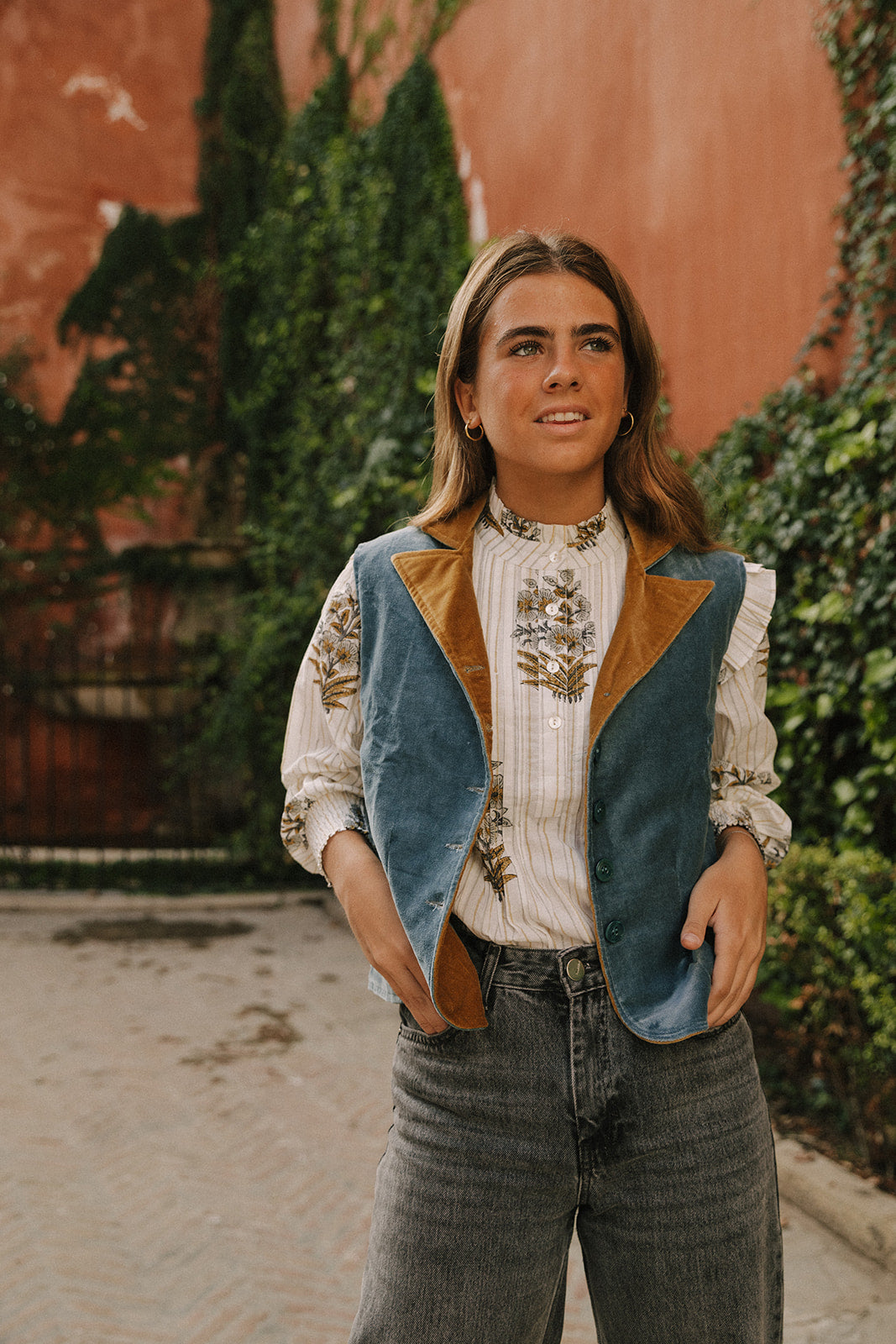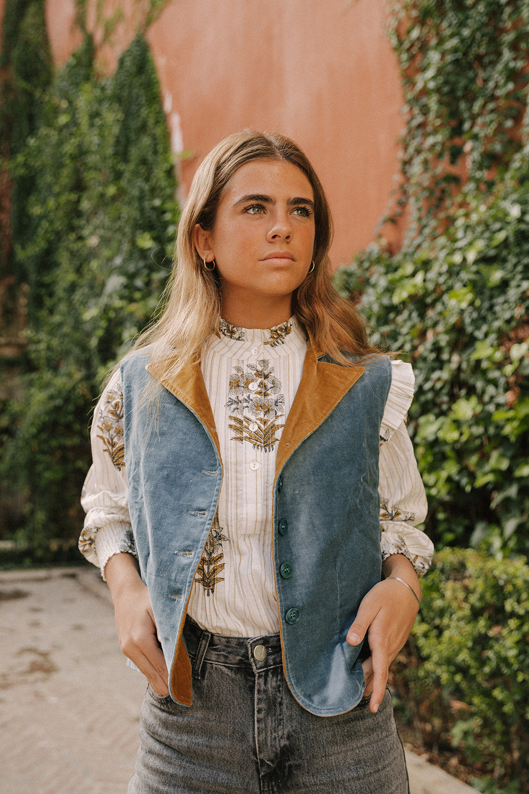CHALECO TERCIOPELO AZUL Y OCRE