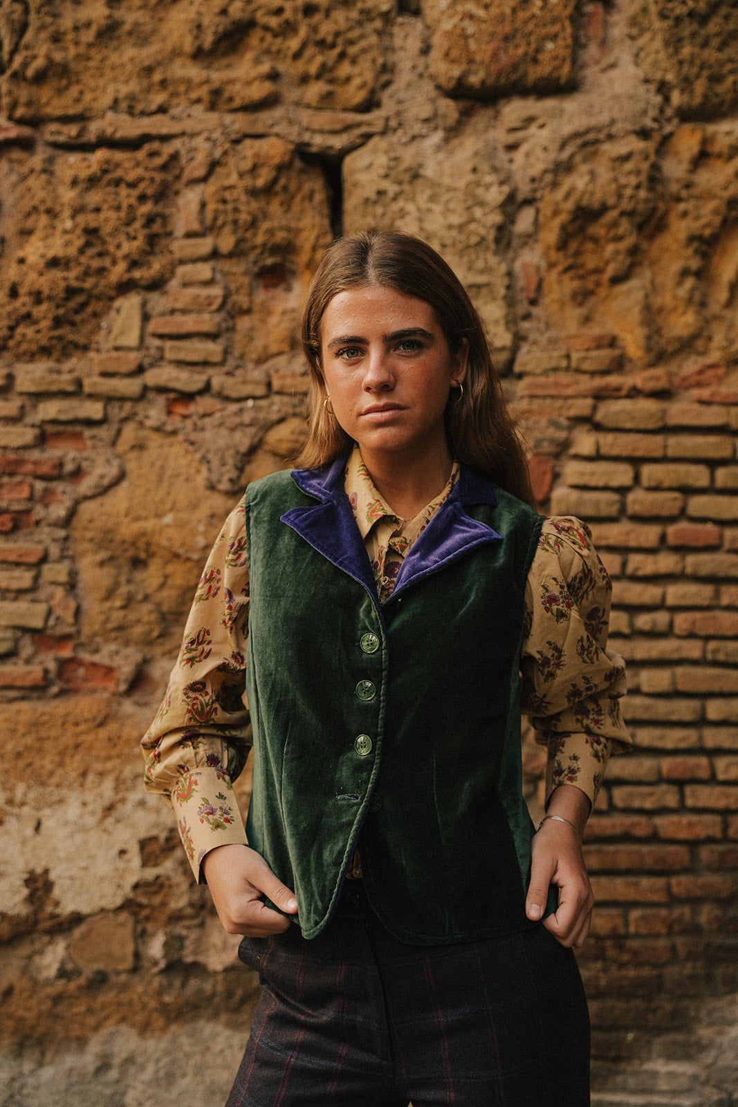 Chaleco de terciopelo escote pico con contraste de color. Cierre con botones en la parte delantera y forro interior. Cada talla corresponde a las equivalencias mencionadas.