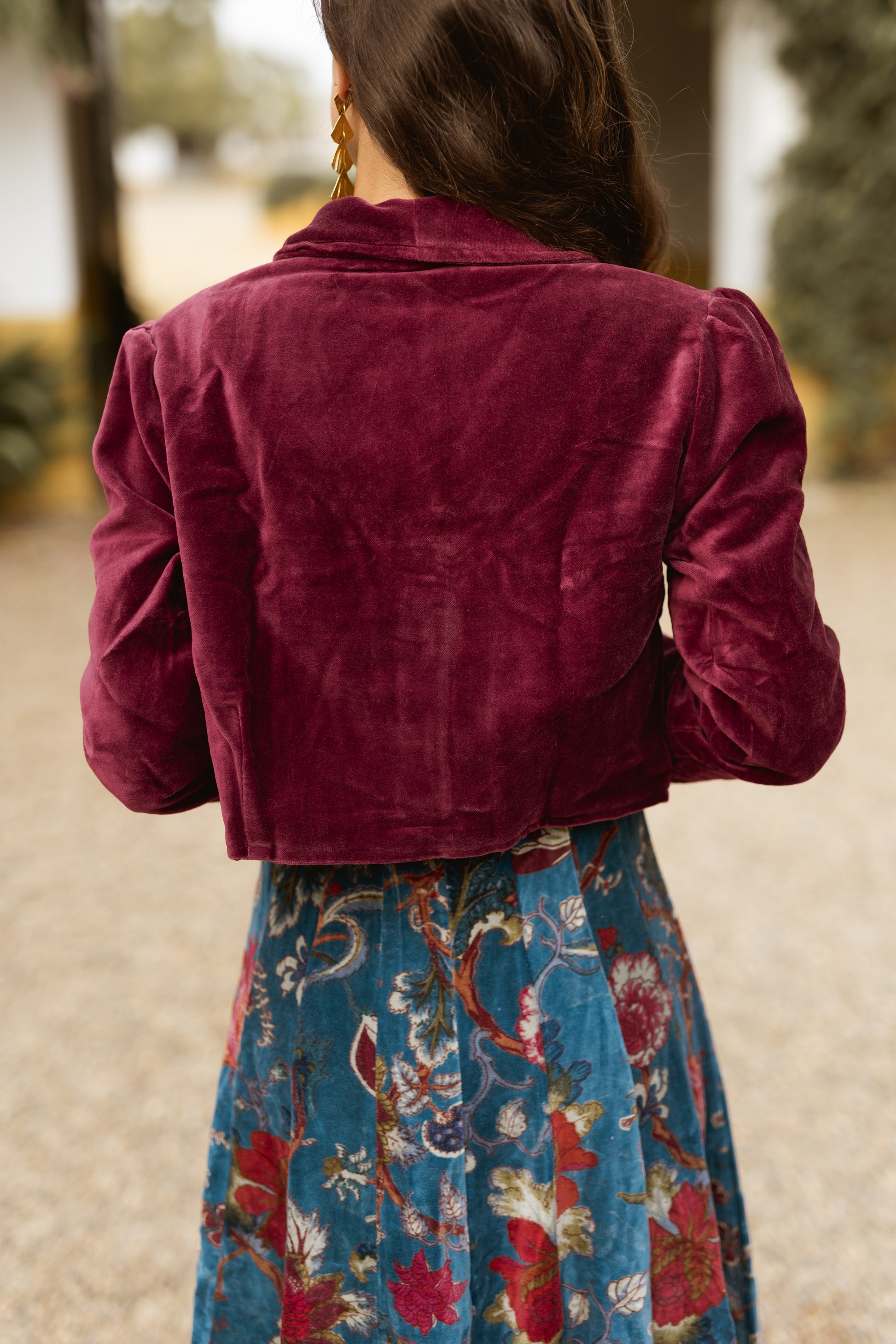 Chaqueta corta de terciopelo, manga abullonada, cierre frontal con botones y ligeramente entallada en cintura.