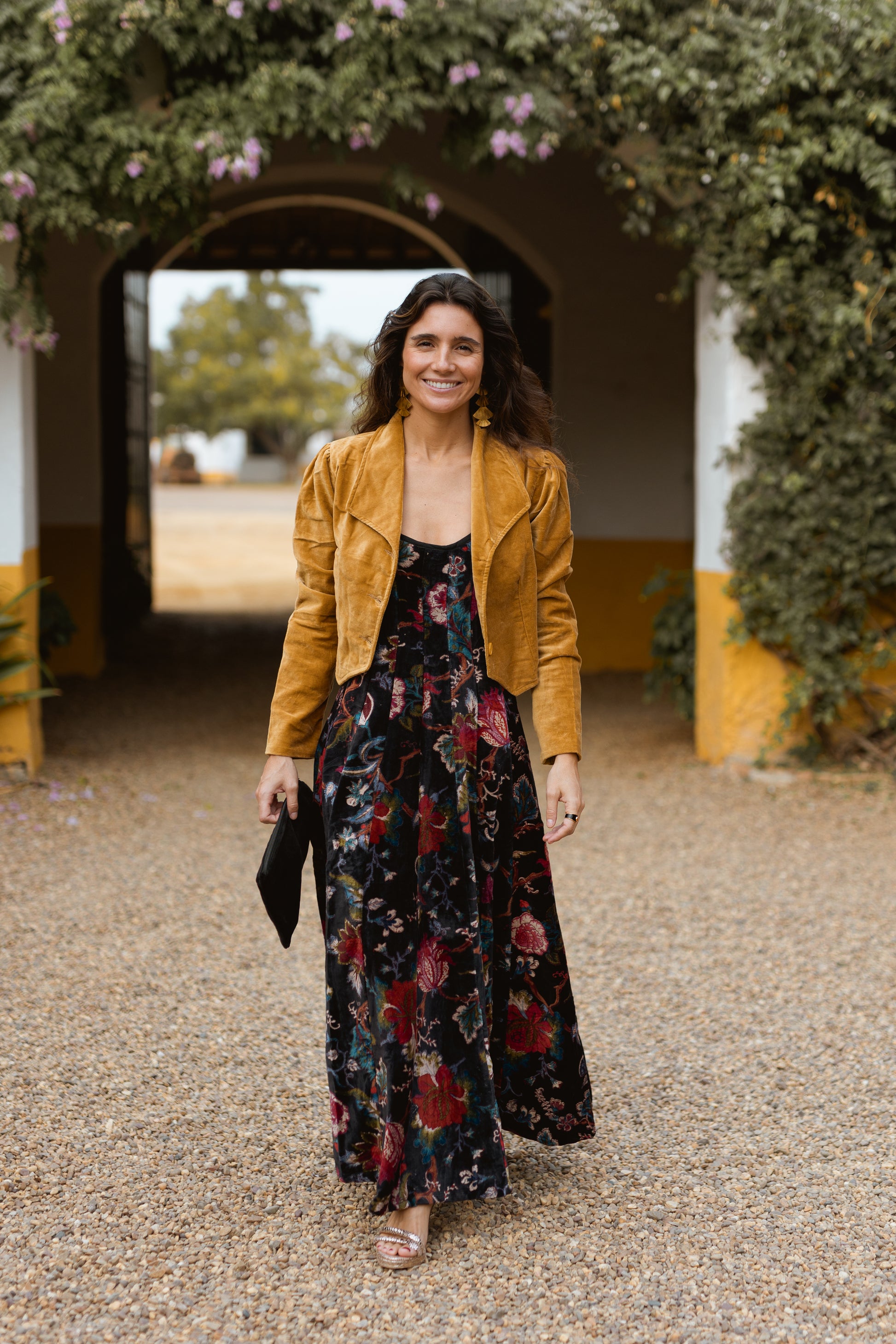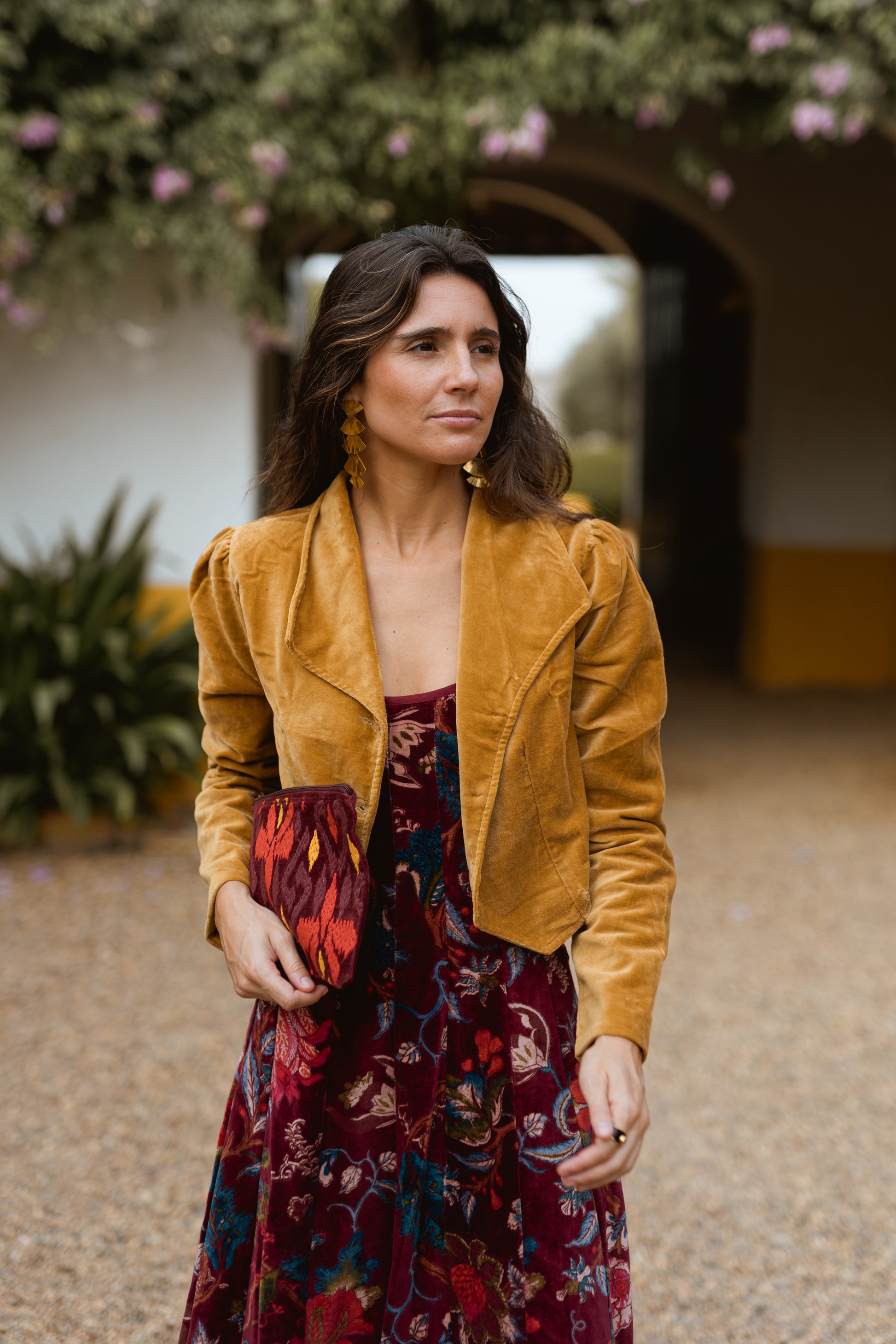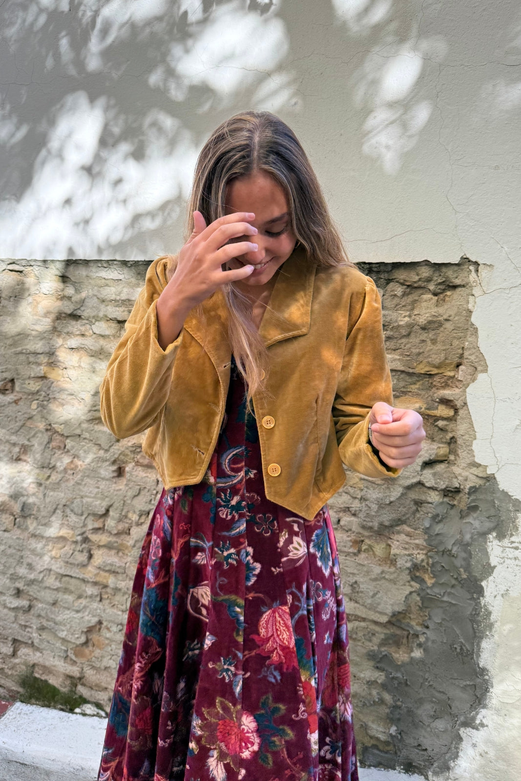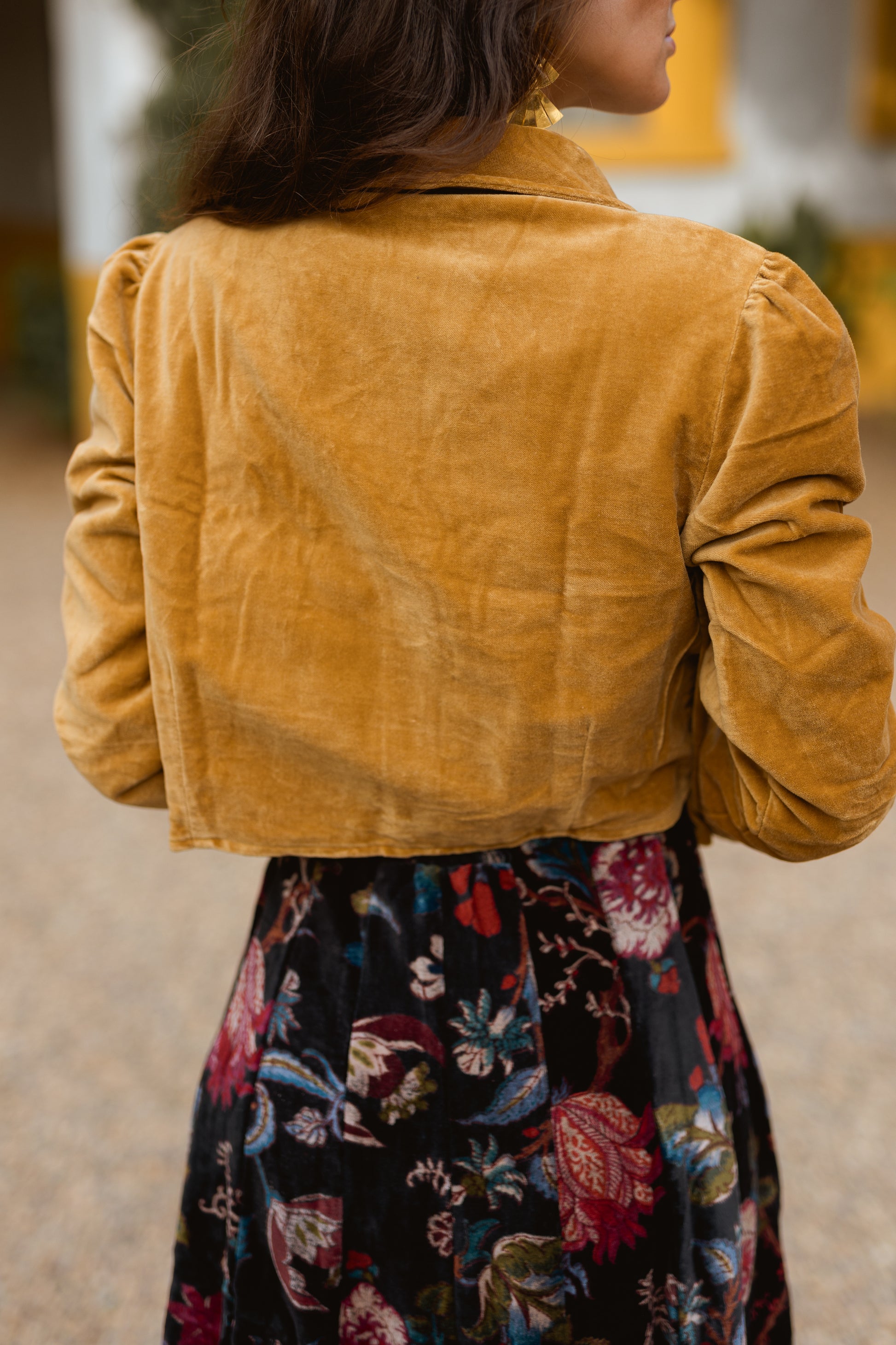 Chaqueta corta de terciopelo, manga abullonada, cierre frontal con botones y ligeramente entallada en cintura.