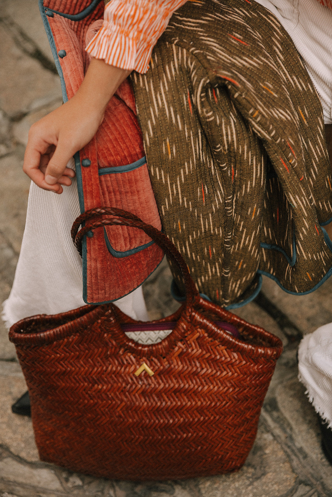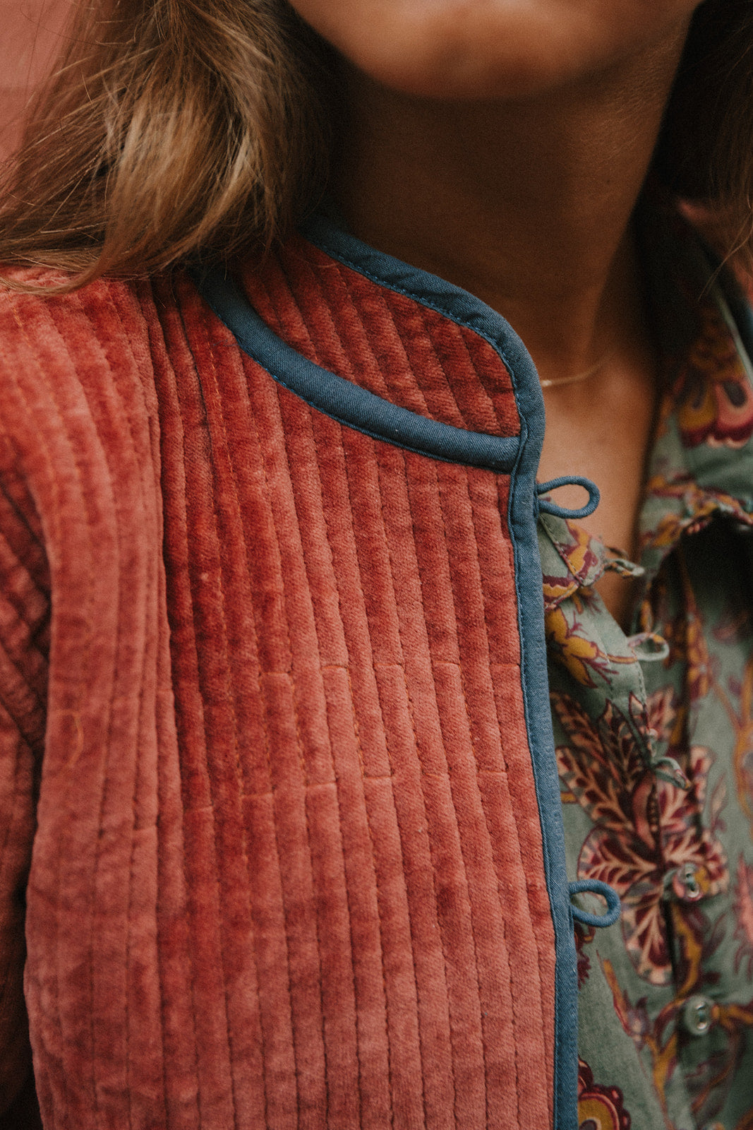 Chaqueta de terciopelo caldera con detalles en gris, es reversible en ikat 100% algodón y tiene dos bolsillos en los laterales y botones forrados en el centro.