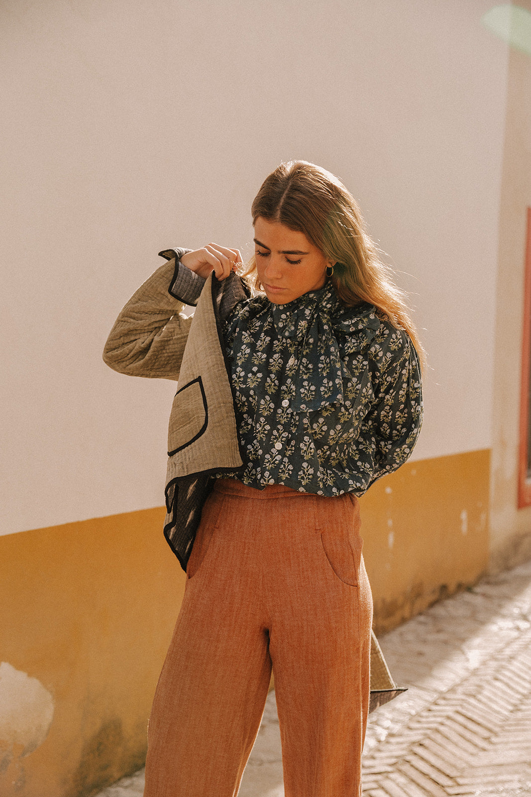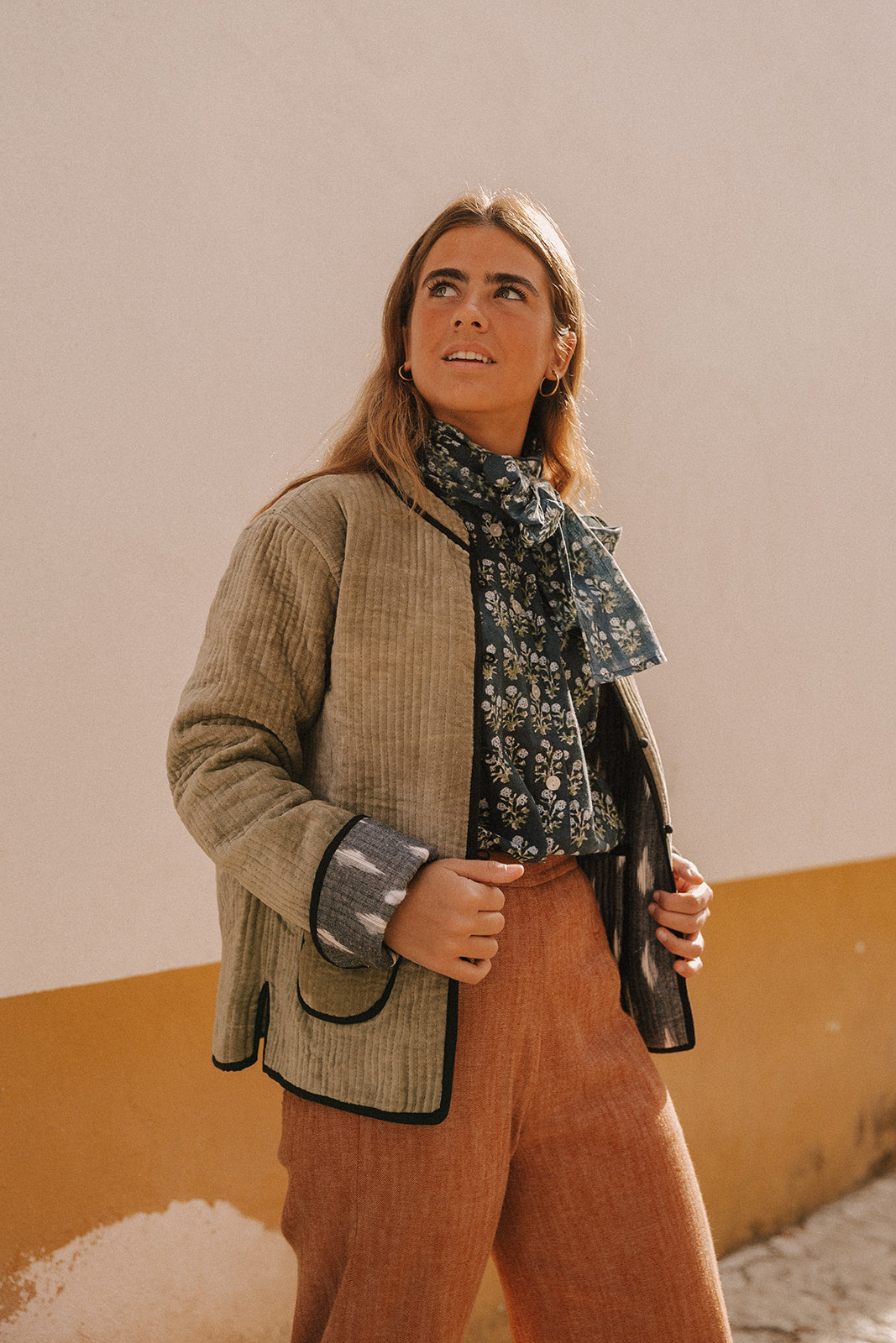 Chaqueta de terciopelo verde claro con detalles en negro, es reversible en ikat 100% algodón y tiene dos bolsillos en los laterales y botones forrados en el centro.