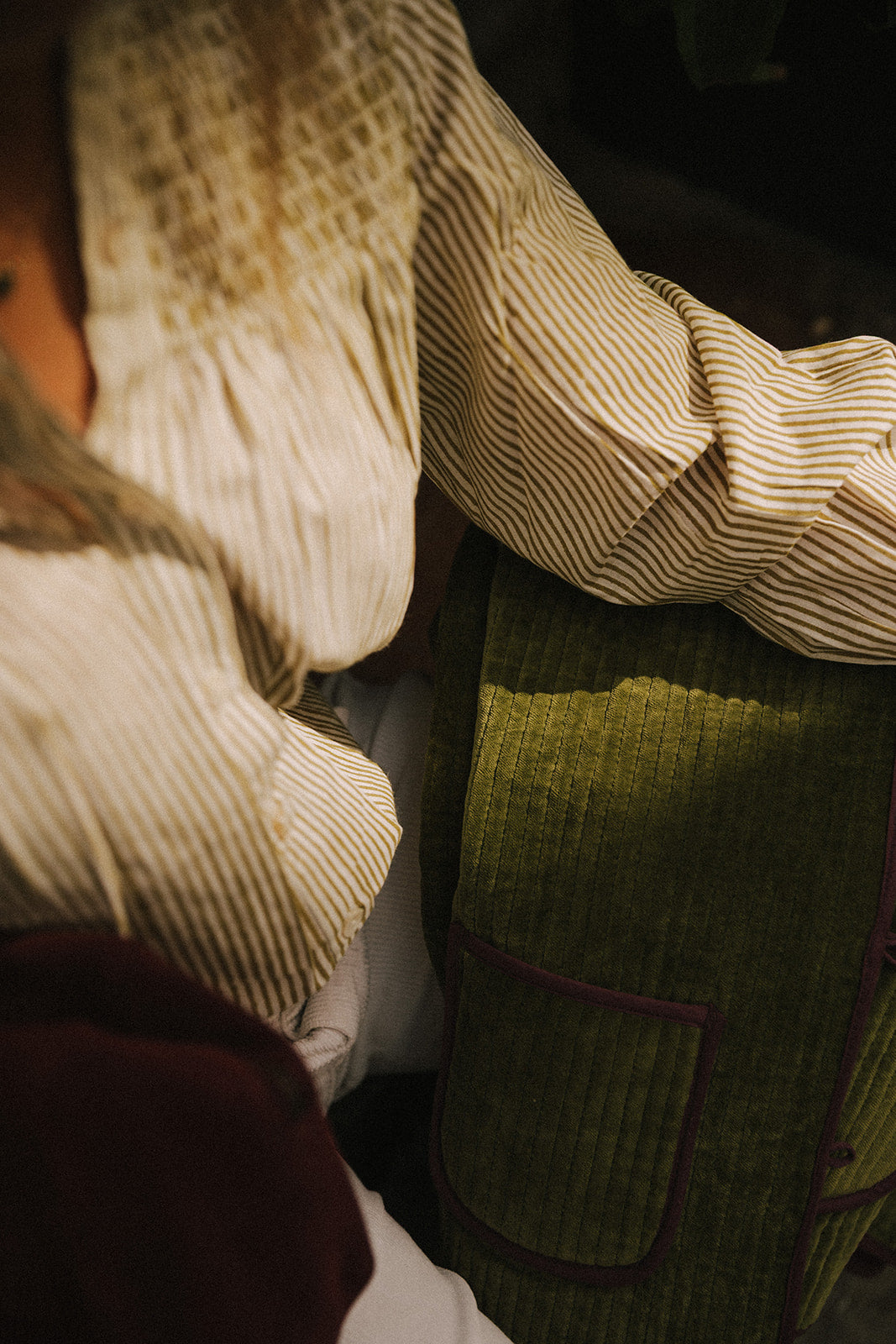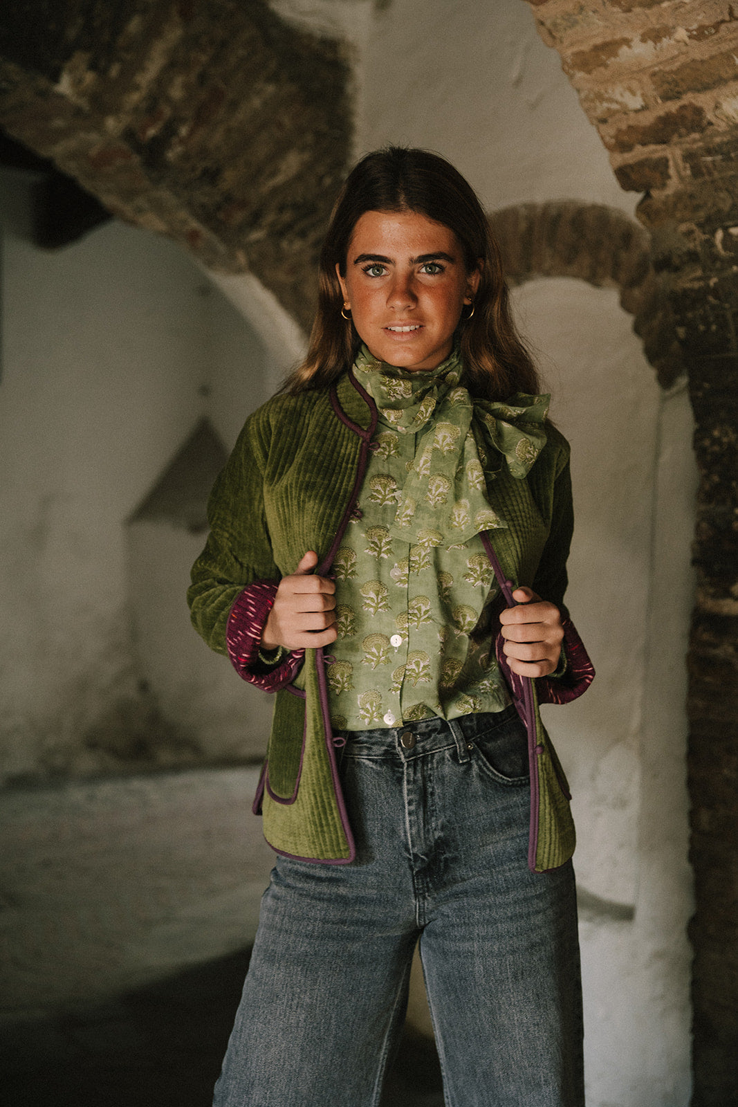 Chaqueta de terciopelo verde con detalles en buganvilla, es reversible en ikat 100% algodón y tiene dos bolsillos en los laterales y botones forrados en el centro.