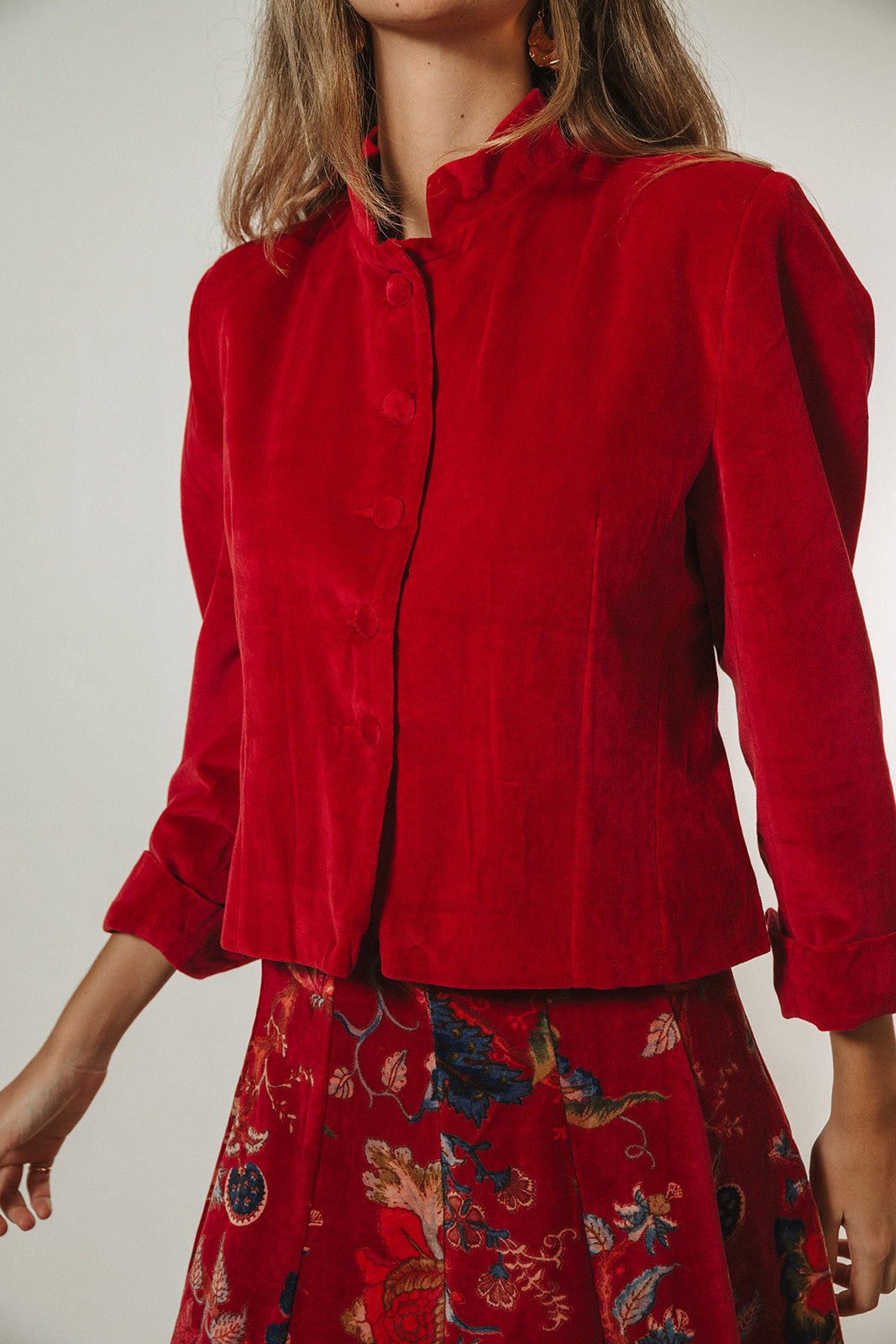 Chaqueta de terciopelo de algodón roja con cuello alto, botones forrados en terciopelo y hombreras.