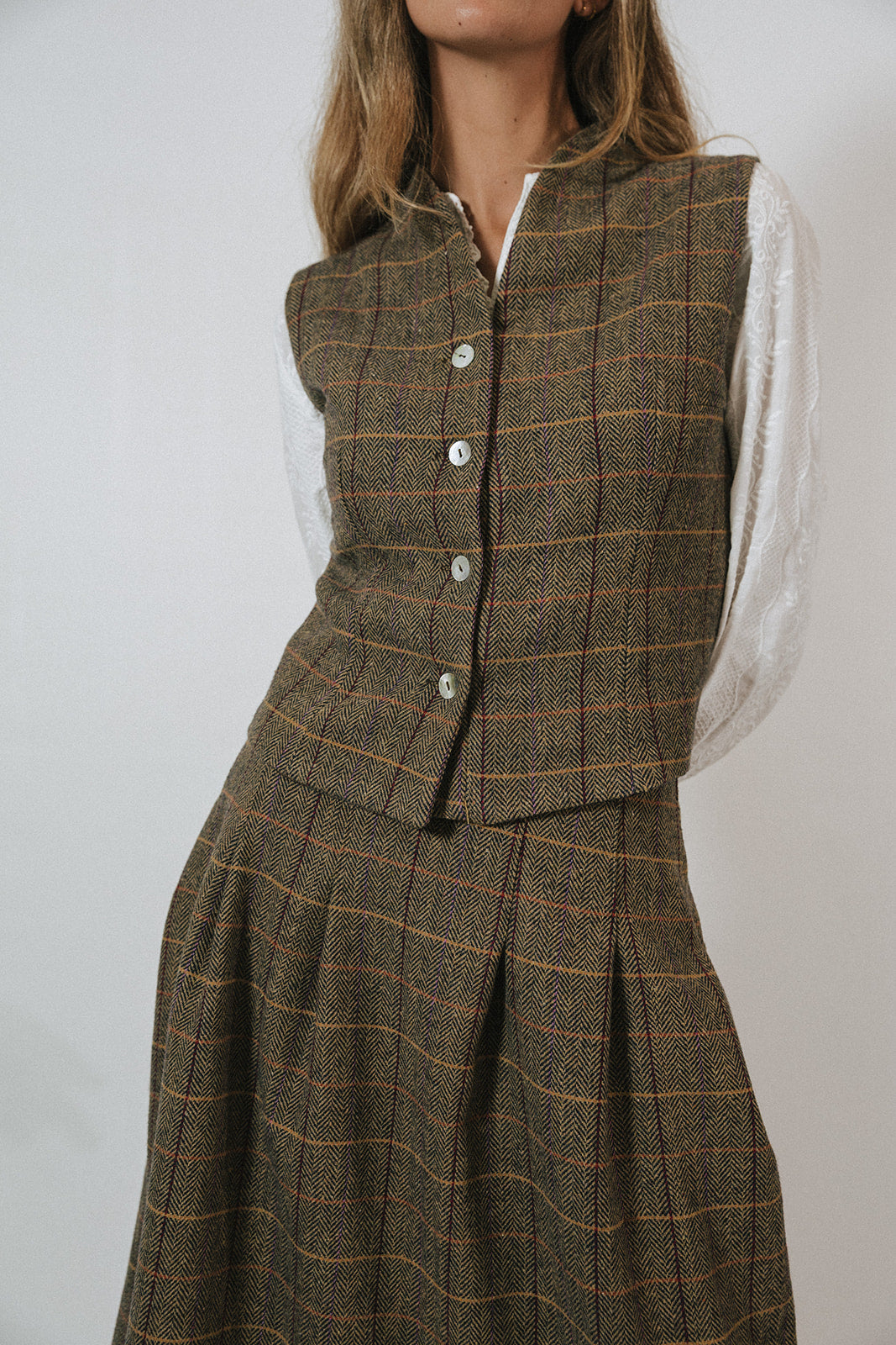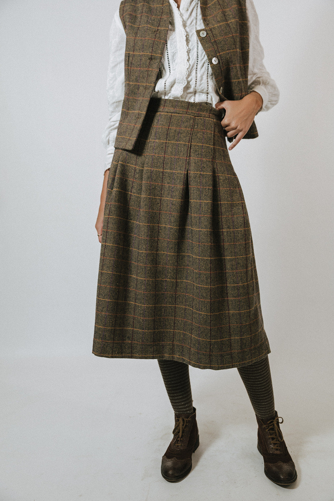 Falda midi en tejido con lana, de cuadros en tono marrón. Tablones en la cintura con cremallera trasera invisible.