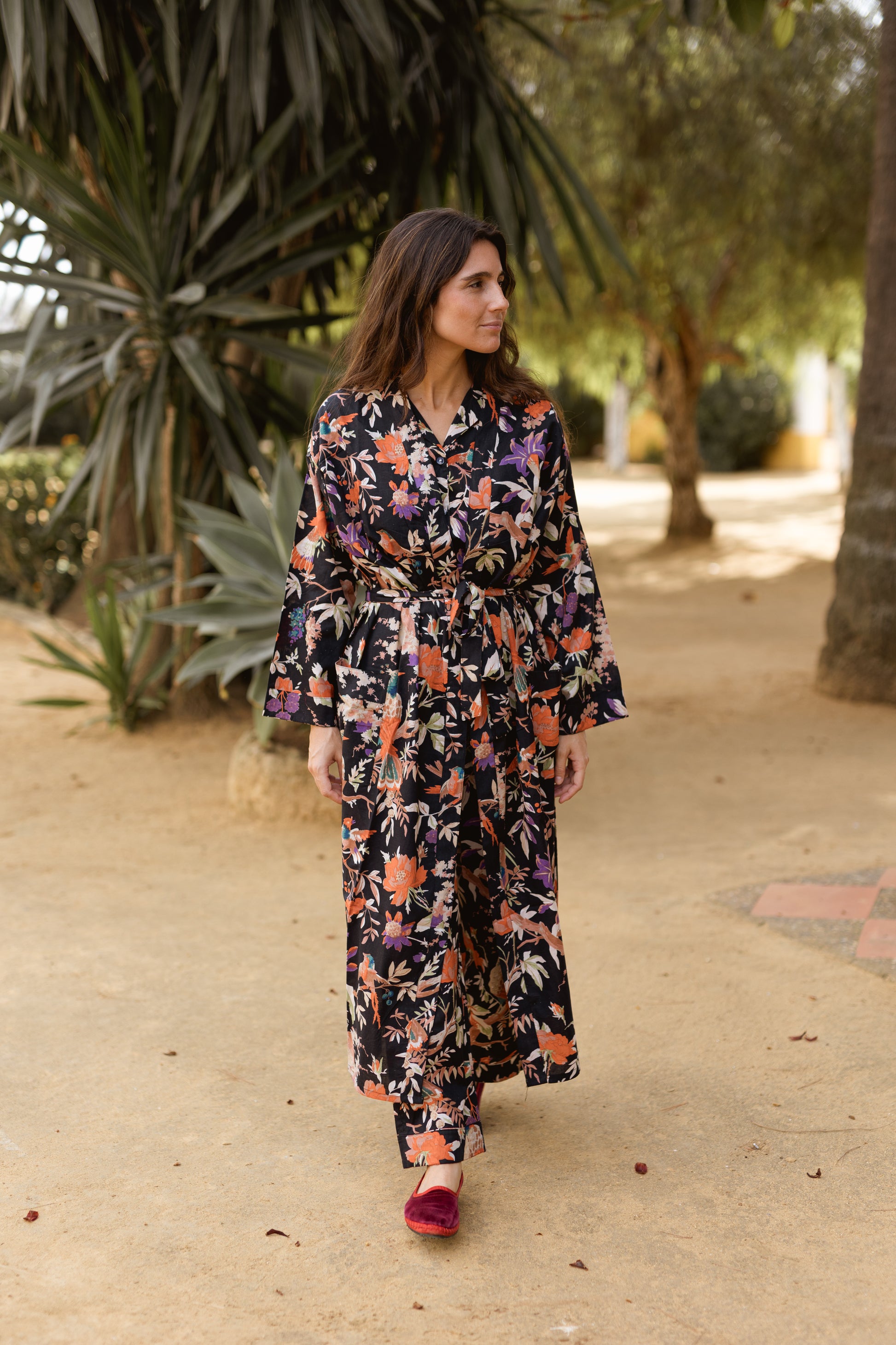 Kimono – bata estampada de algodón 100%. Cinturón y dos bolsillos. Los distintos estampados los creamos con la técnica blockprint, la cual se realiza con sellos de madera tallados y tintes naturales, es una de las técnicas más tradicionales procedentes de la India. Al ser la tela hecha a mano con tintes naturales, puede presentar alguna mancha de pintura que no es considerado defecto. Creamos piezas únicas y artesanales.