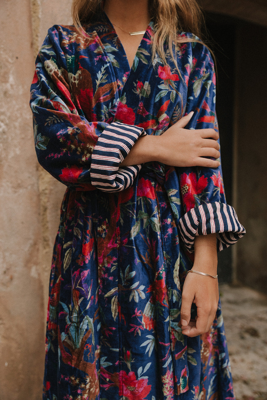 Kimono – bata estampada de terciopelo. Cinturón y dos bolsillos. Al ser el tejido estampado a mano con tintes naturales, puede presentar alguna mancha de pintura que no es considerado defecto. Creamos piezas únicas y artesanales. Talla Única.