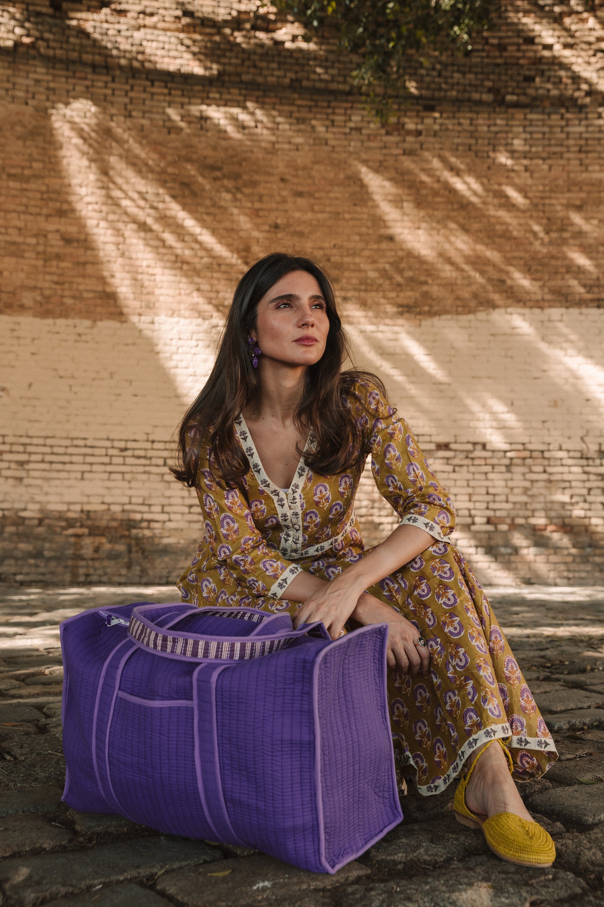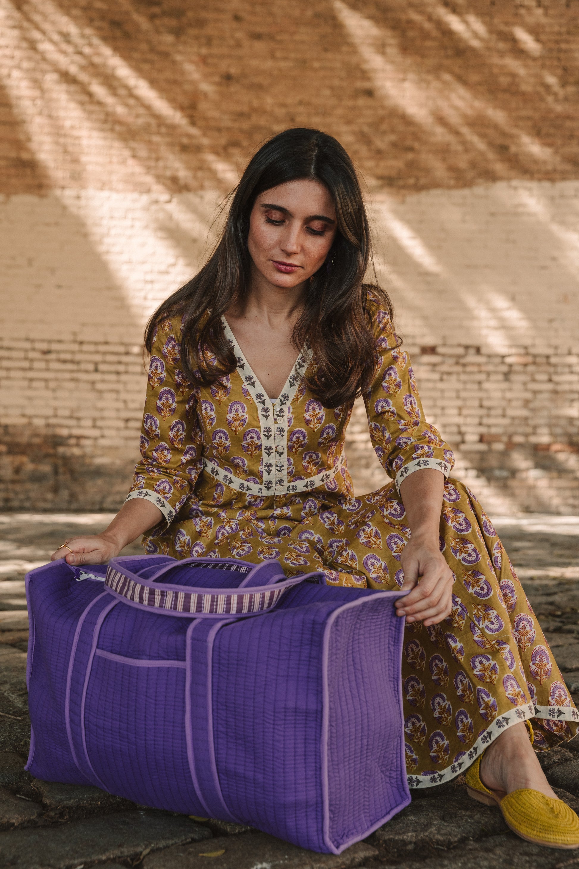 Maleta de algodón morado y malva con neceser incluido con forro de algodón estampado. Cuenta con compartimento principal y cierre con cremallera. Es el tamaño perfecto para bolso de mano en cabina.