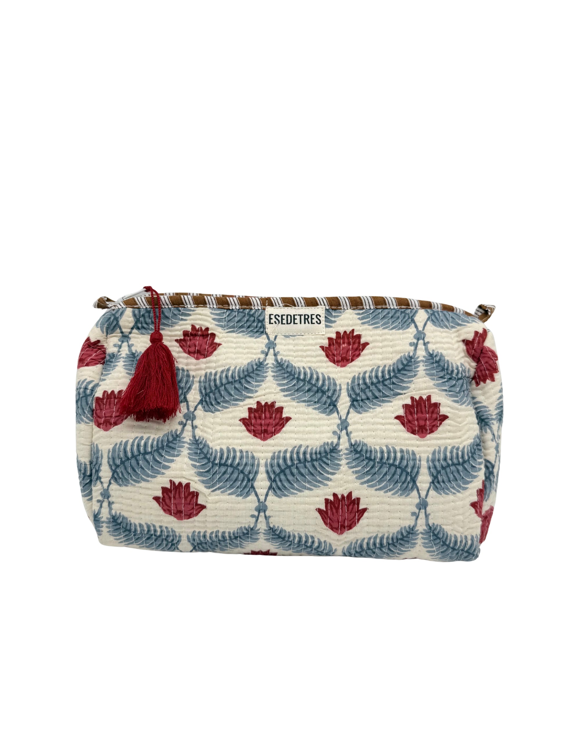 Neceser de algodón estampado con forro interior plastificado con bolsillos interiores. Cierre superior con cremallera.