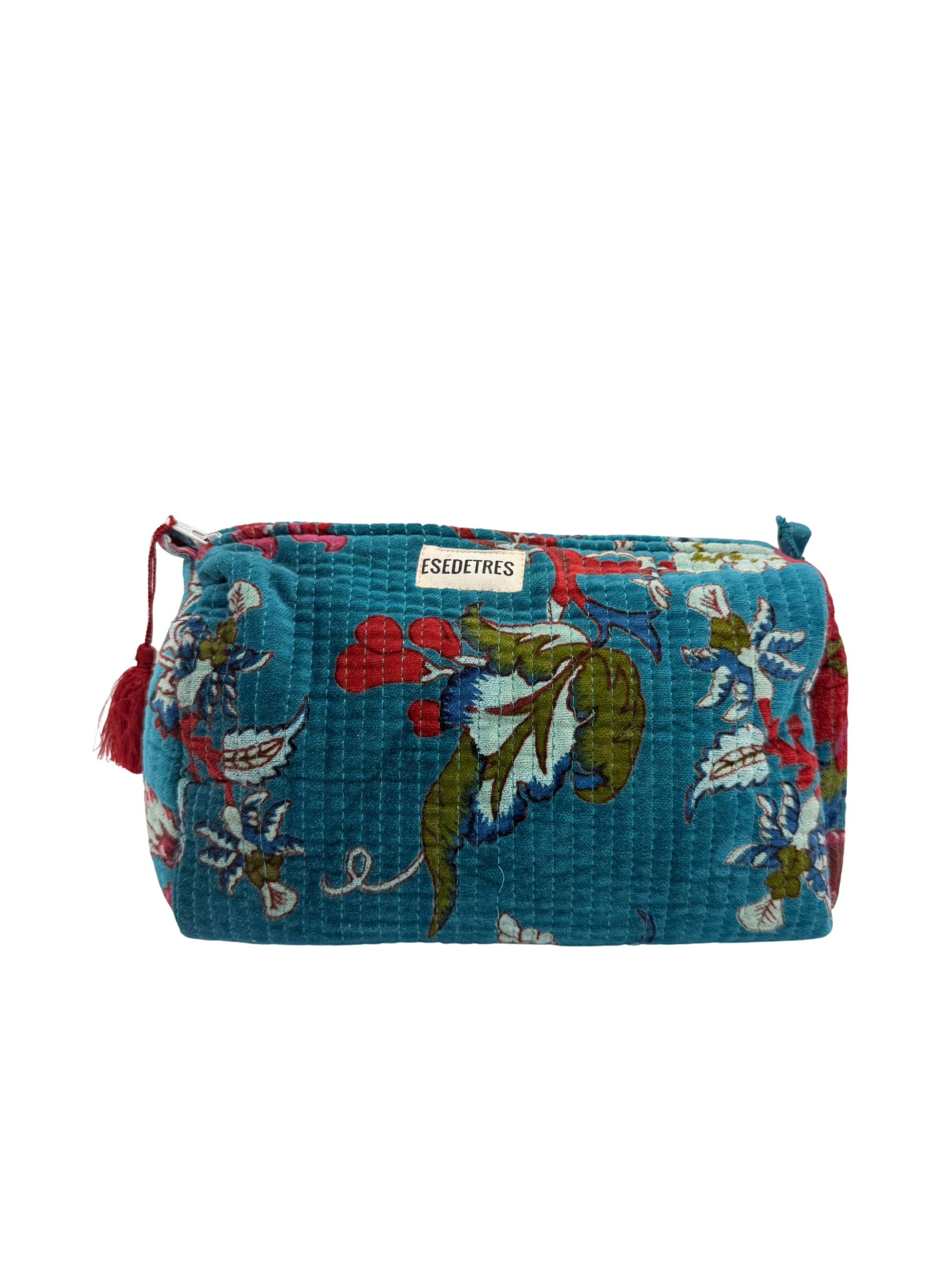 Neceser de algodón estampado con forro interior plastificado con bolsillos interiores. Cierre superior con cremallera.