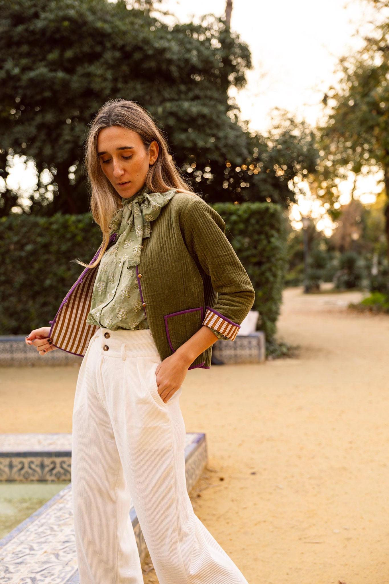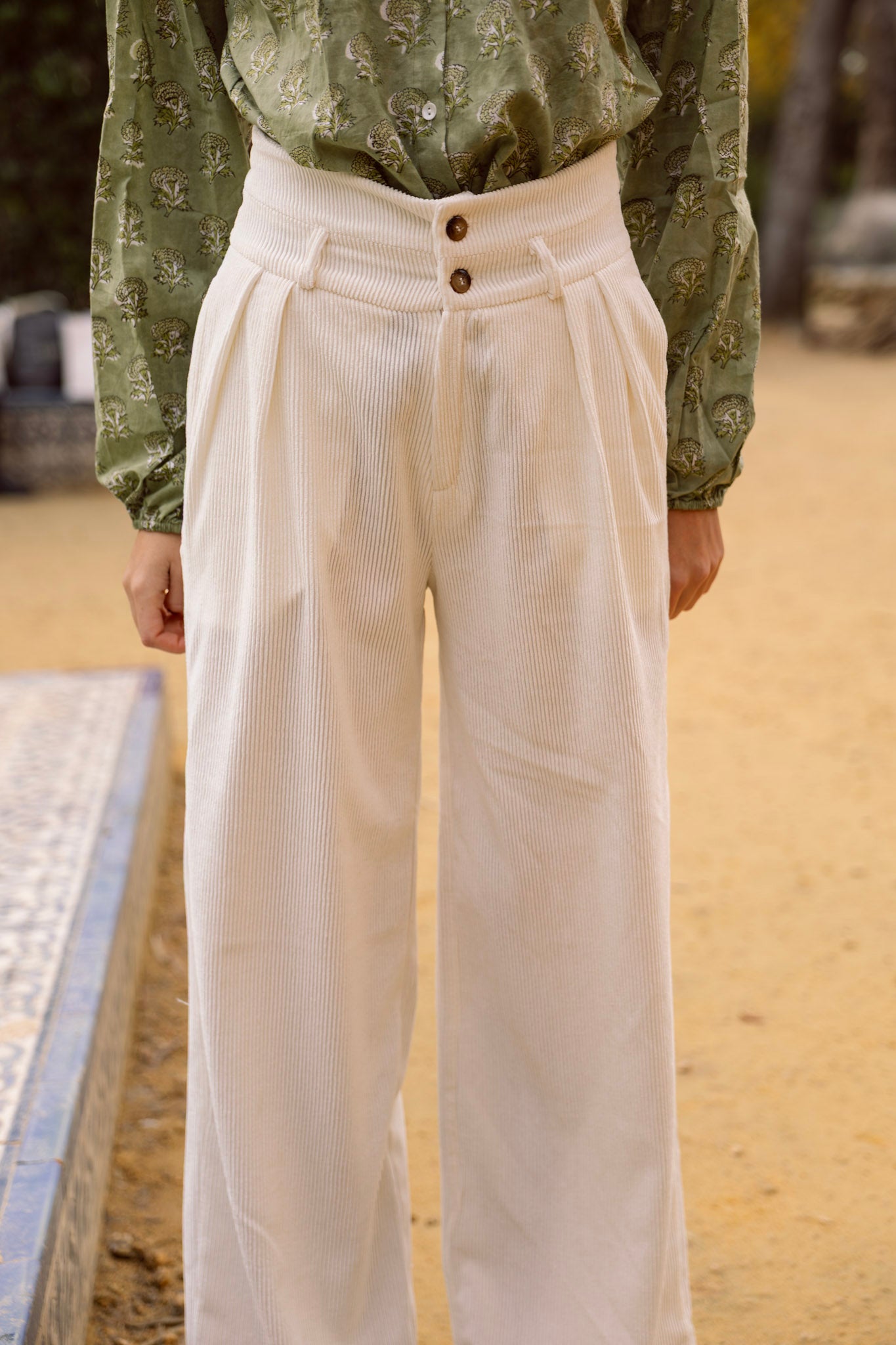Pantalón de pana beige con diseño de talle alto y silueta de pierna ancha