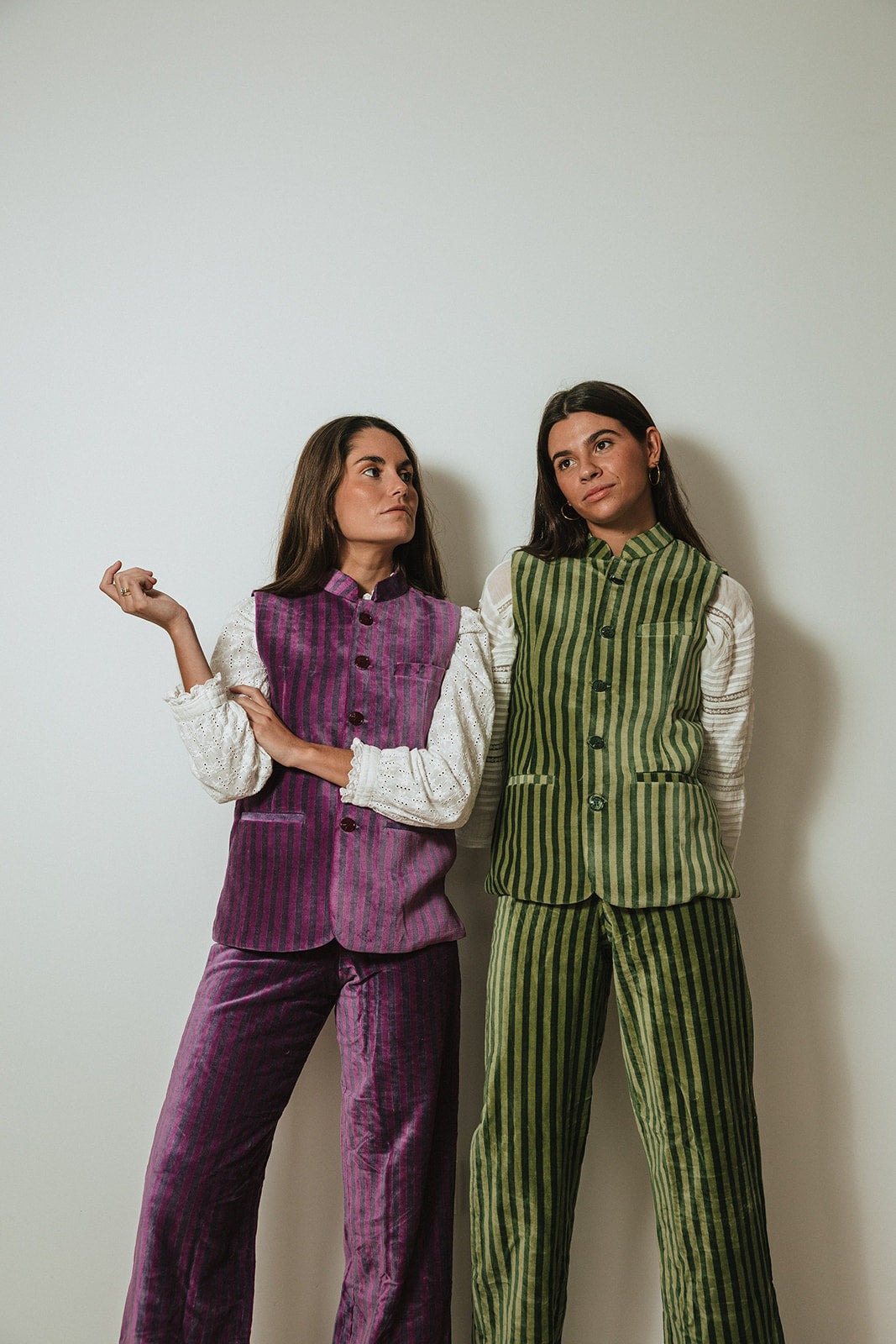 Pantalón de terciopelo de algodón de rayas en tonos morado y malva. Cierre mediante cremallera oculta por tapeta y botón. Al ser la tela hecha a mano con tintes naturales, puede presentar alguna mancha de pintura que no es considerado defecto. Creamos piezas únicas y artesanales.