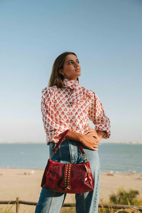 Diseñado en piel y con una estructura de líneas curvas, este bolso ofrece una capacidad sorprendente y comodidad. La tira con detalles de tachuelas en el centro aportan un detalle distintivo y sofisticado, mientras que los acabados en oro gastado reflejan el inconfundible estilo de Caos. En su interior, un bolsillo práctico te ayuda a mantener todo en orden.