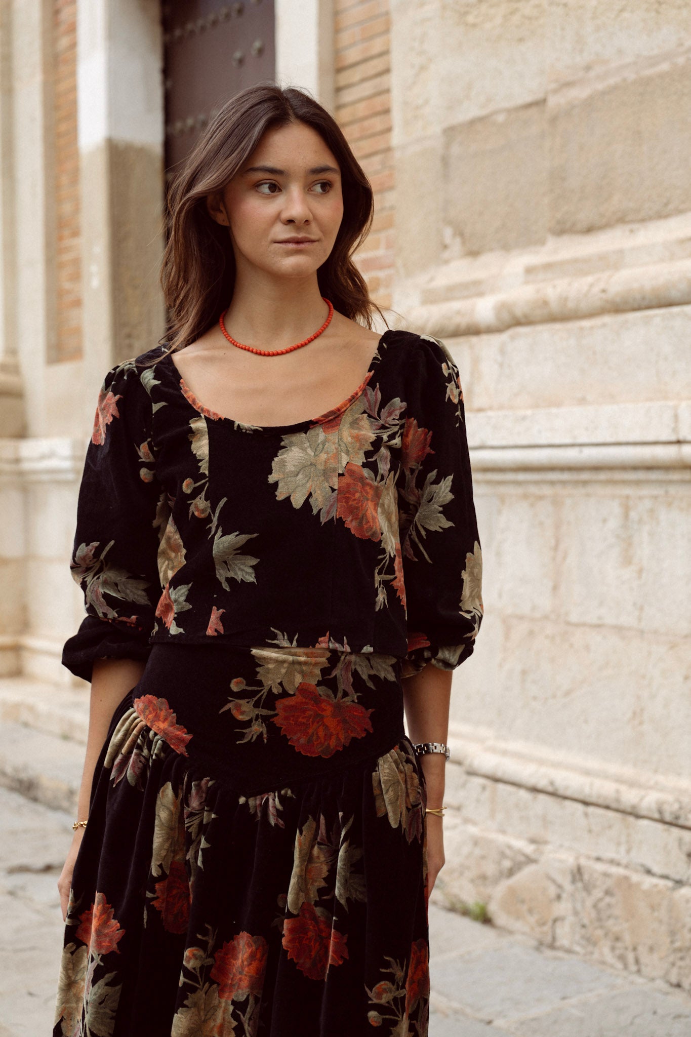 Top de terciopelo negro estampado. Detalle de mangas abullonada, cuello redondo y cremallera lateral. Destaca por ser 100% terciopelo de algodón estampado. Al ser la tela hecha a mano con tintes naturales, puede presentar alguna mancha de pintura que no es considerado defecto. Creamos piezas únicas y artesanales.