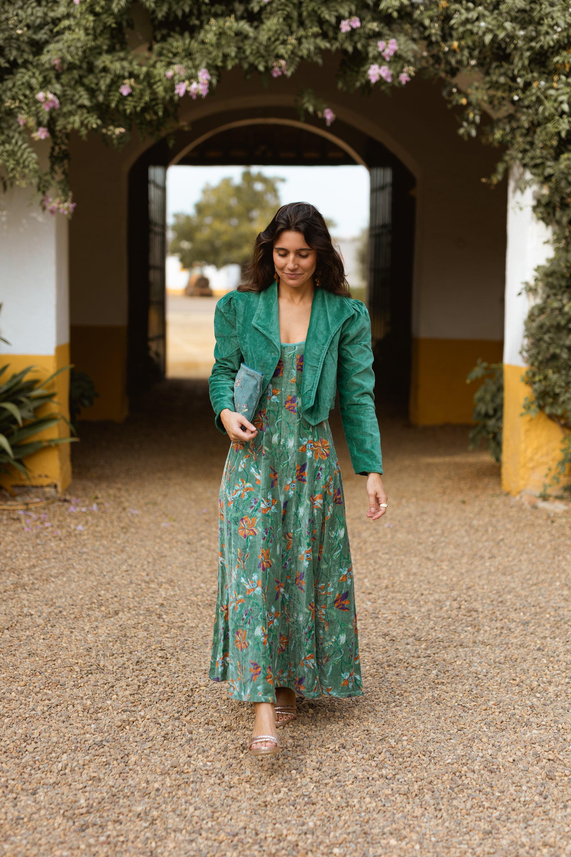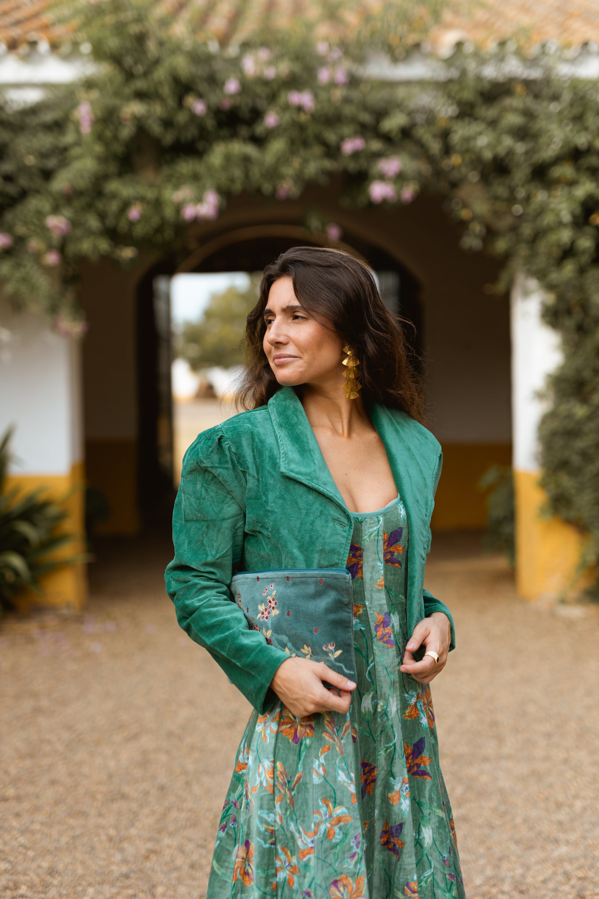 Vestido de construcción en paneles, corte corsé y escote cuadrado en la parte superior con falda en forma de A. Incluye espalda elástica para un mejor ajuste y cierre lateral. Confeccionado en terciopelo 100% algodón. Los distintos estampados los creamos con la técnica blockprint, la cual se realiza con sellos de madera tallados y tintes naturales, es una de las técnicas más tradicionales procedentes de la India. Al ser la tela hecha a mano con tintes naturales, puede presentar alguna mancha de pintura que no es considerado defecto. Creamos piezas únicas y artesanales.